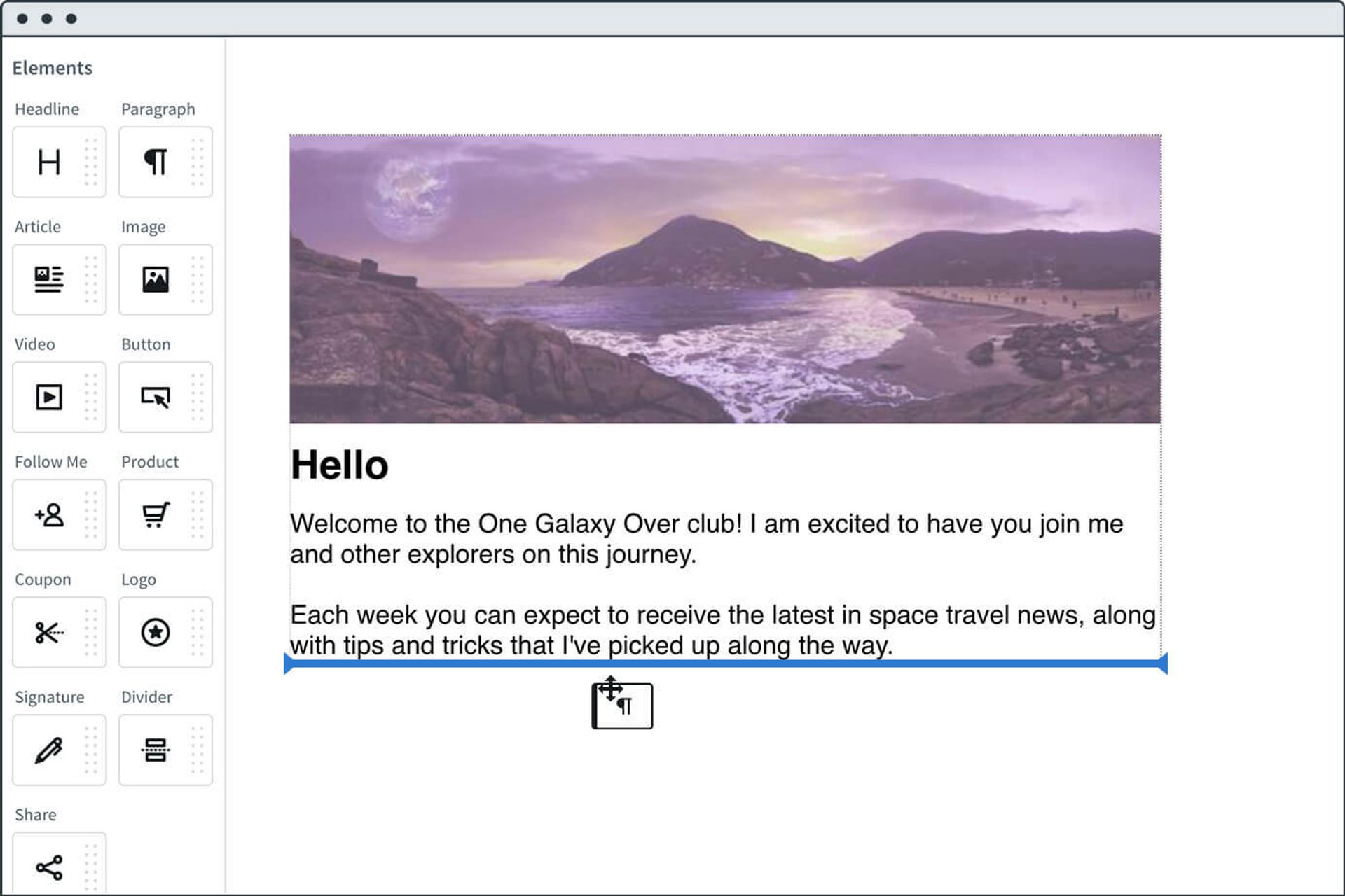 Keeping in theme, AWeber’s email builder features are more basic and friendly to the beginner. They’re designed to help you create great-looking emails without overcomplicating things. To start off, they also have a drag-and-drop editor that allows you to move elements like text blocks, images, buttons, and dividers around to build your email layout exactly how you want. It’s perfect for creating professional emails without needing any design or coding skills.