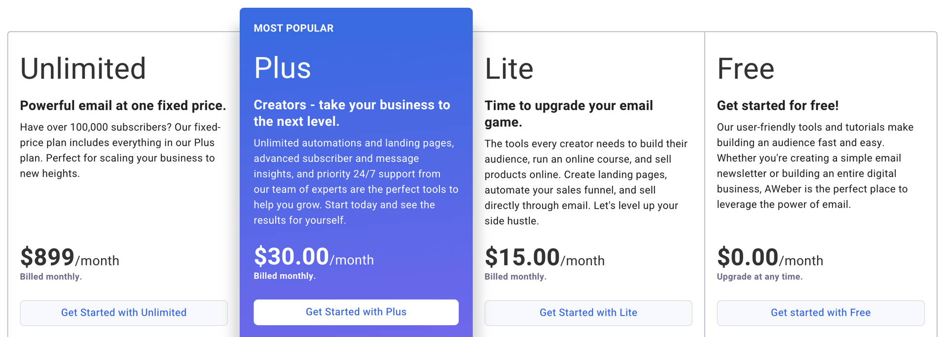AWeber’s four tiers are Free, Lite, Plus, and Unlimited. The Free plan is very bare bones, only allowing you to import 500 contacts max.