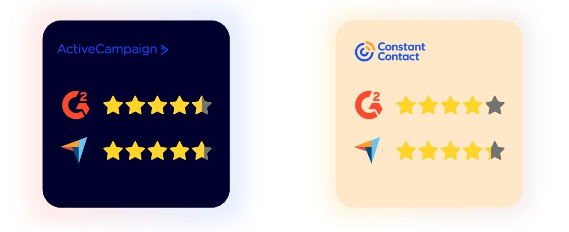 ActiveCampaign and Constant Contact both have broadly positive sentiment on popular independent review sites, though ActiveCampaign is slightly ahead.