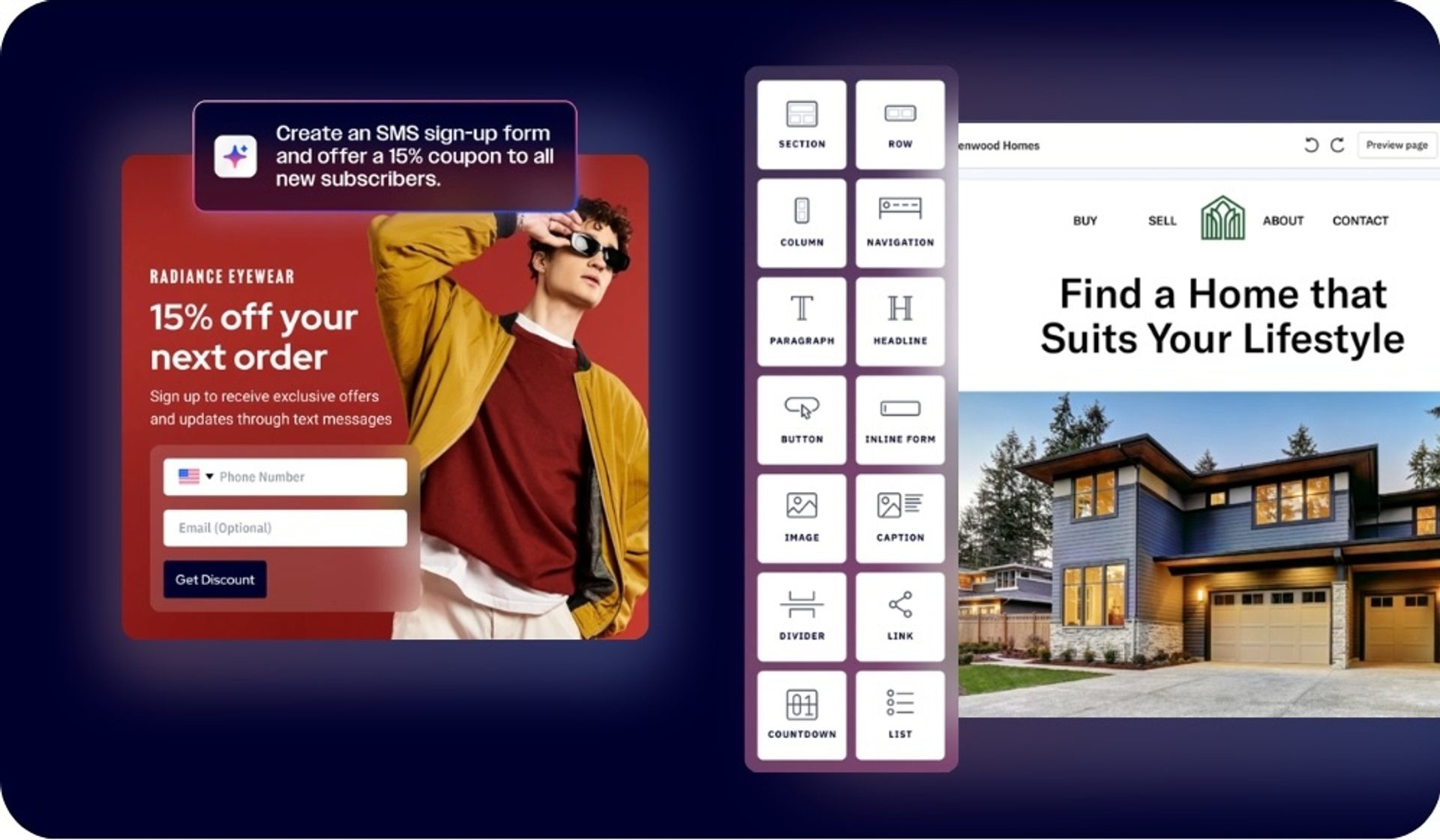 Constant Contact provides a landing page builder as part of the signup form builder, rather than a standalone tool. Forms are built primarily for audience growth: create a page, share the link, and collect new email and SMS contacts quickly. You can also share lead magnet forms with customizable surveys and quizzes to social feeds, websites, or via QR codes.