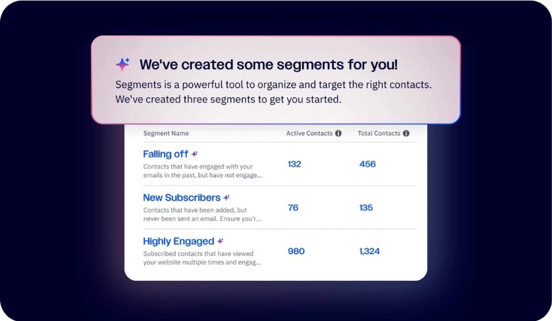 Additionally, AI-suggested segments automatically surface meaningful audience insights that you can target, improving relevance and reducing over-mailing.