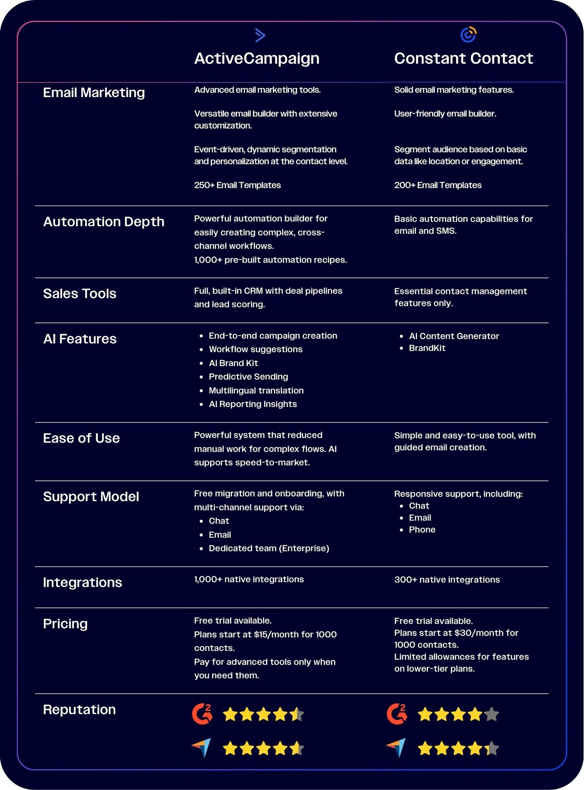 Constant Contact has genuine strengths: integrated event management and phone support on all plans serve certain use cases well. But for teams focused on automation, personalization, and multi-channel marketing, review data consistently favors ActiveCampaign.