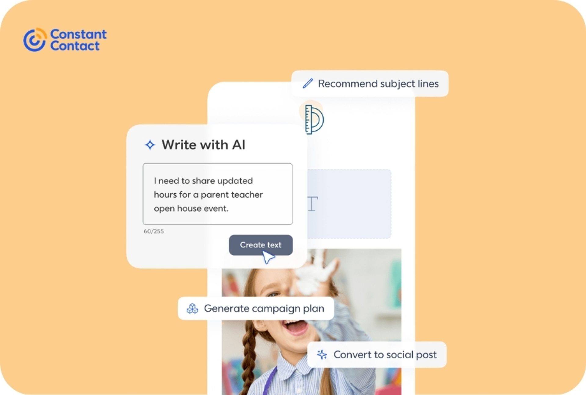 Constant Contact’s AI is focused on helping small teams create faster, especially around writing and repurposing content. Their AI marketing tools are made up of:
