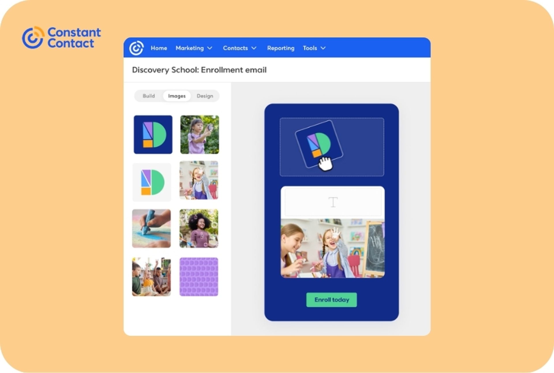 Constant Contact's drag-and-drop editor has 200+ pre-made templates and content blocks for headings, layouts, images, and footers that help create an email in a few clicks.