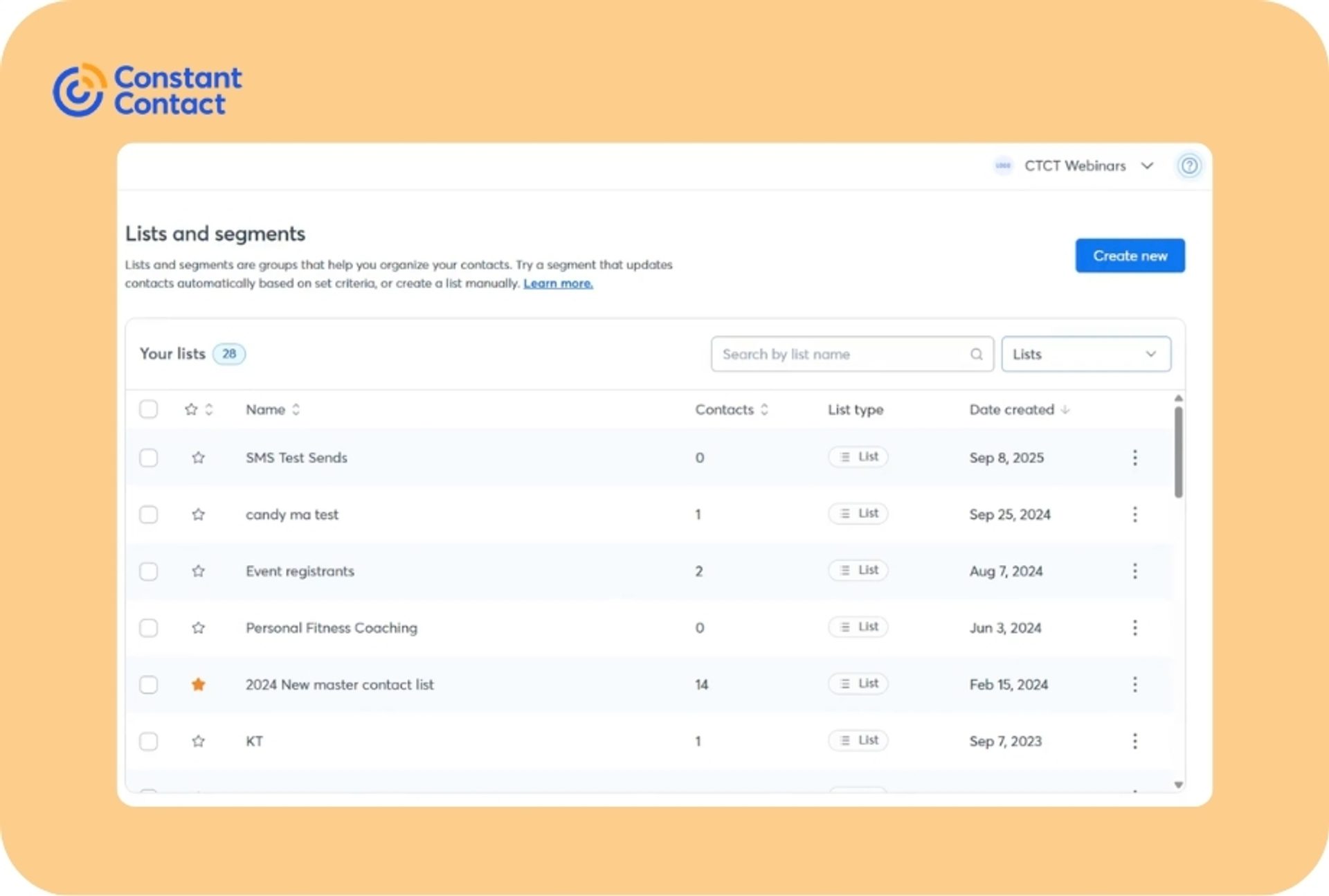 Constant Contact keeps targeting simple for smaller lists and straightforward programs. You can organize contacts using lists, then create segments by filtering contact details and certain engagement signals like clicks. Basic logic (AND/OR) defines who should receive a message.