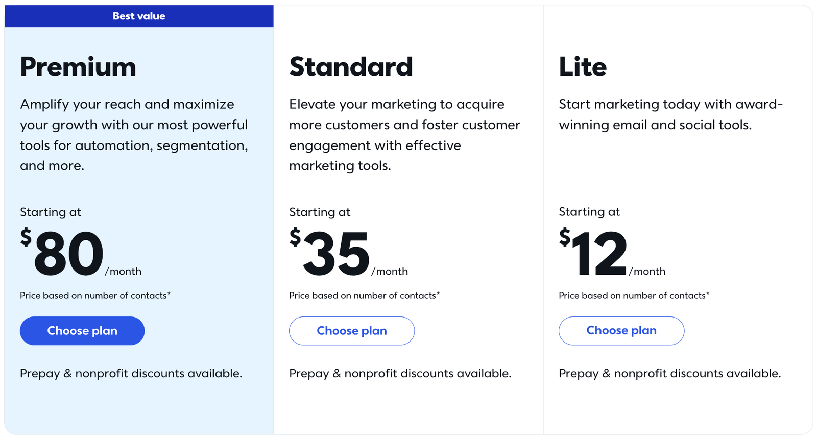 Their Lite plan starts at $30/month (with 1,000 contacts), making it doubly as expensive as ActiveCampaign’s entry-level plan. The Lite plan covers the basics of email marketing, including customizable templates, list management, and basic reporting.