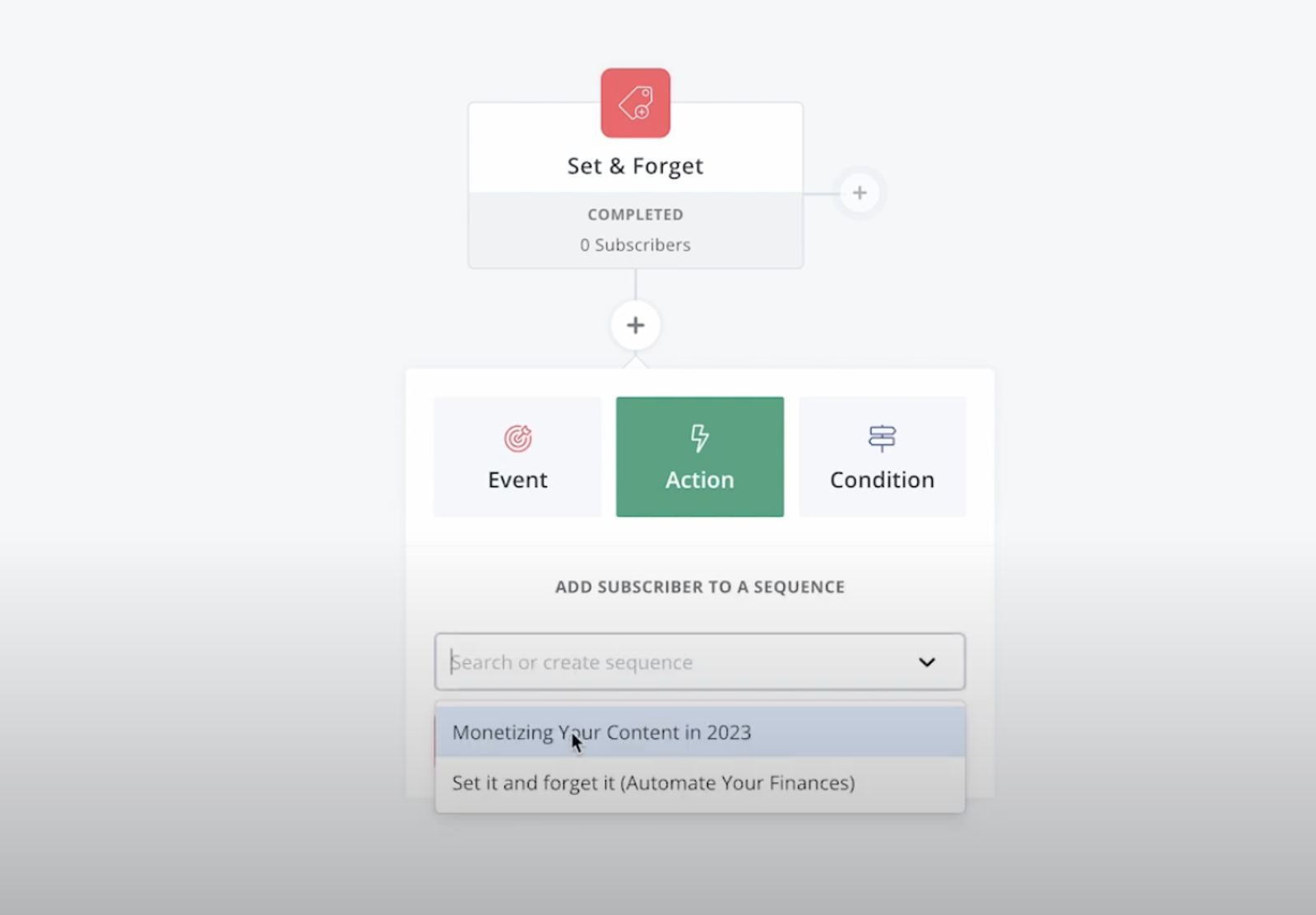 From there, you can set up actions, like sending emails, tagging subscribers, or moving them into another sequence. However, its capabilities are more limited than platforms with advanced logic-building tools. It also doesn’t offer automation goals, so you won’t be able to set specific milestones or track when subscribers meet them as part of a workflow.