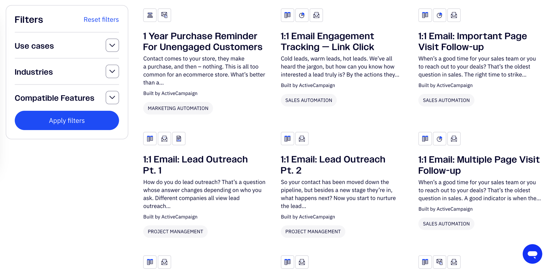 ActiveCampaign’s automation capabilities are incredibly advanced but simple to use. There are hundreds of "automation recipes" you can use right out of the box and customize with your own tags, custom fields, and content.