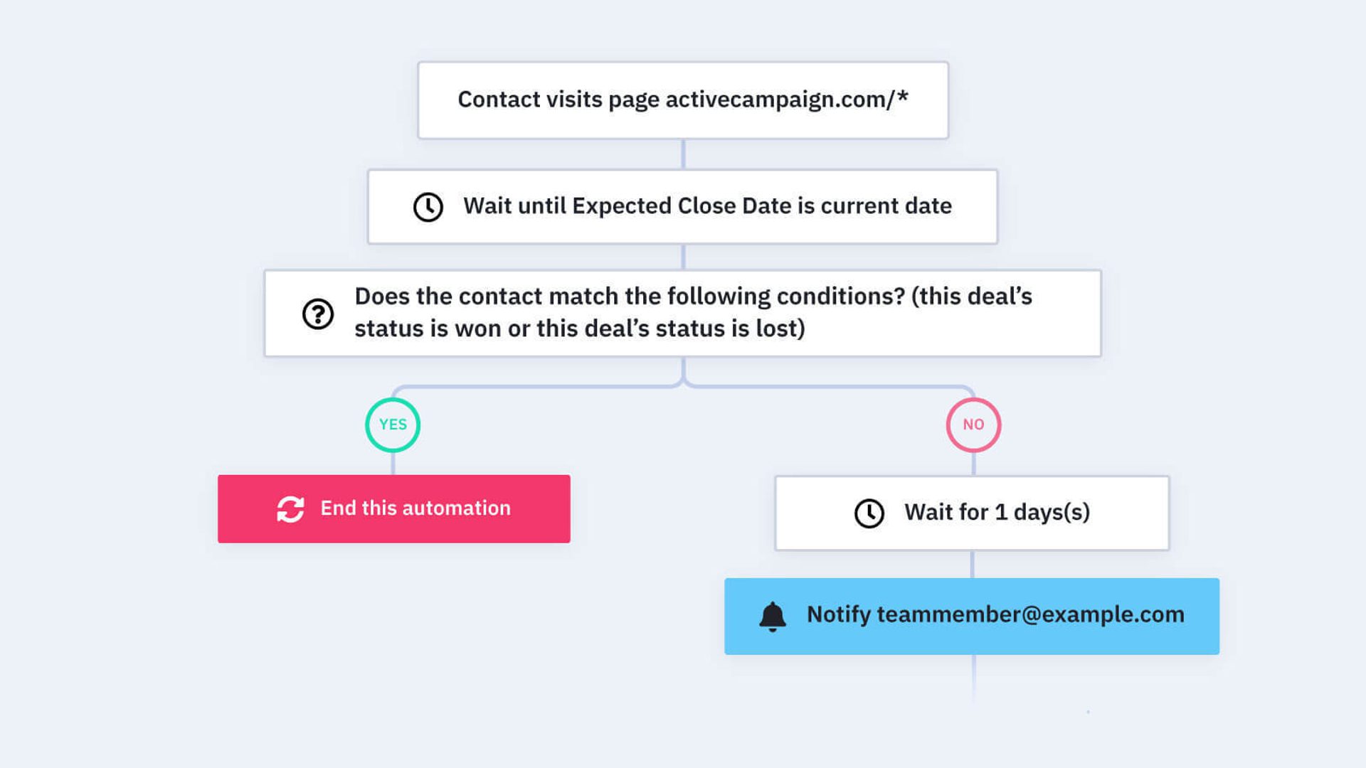 ActiveCampaign’s visual automation builder makes it easy to see complex workflows. You can add actions like “wait,” “if/then” logic, and triggers to shape each contact’s path. This allows for conditional flows based on specific behaviors, like page visits or specific clicks, making it perfect for in-depth customer journeys.