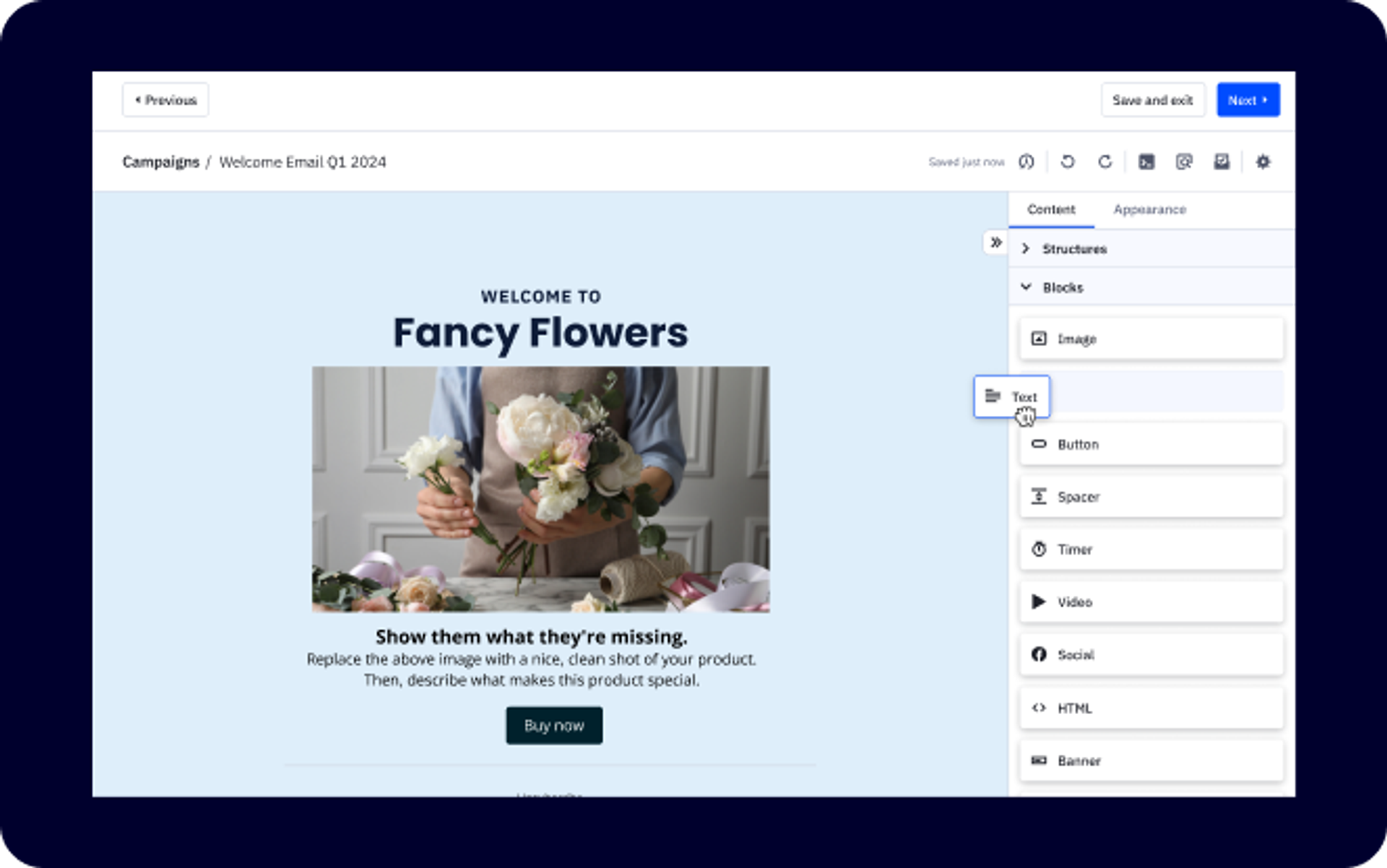 ActiveCampaign offers an intuitive, beginner-friendly drag-and-drop editor packed with helpful features for advanced users. You can save custom content blocks to reuse in future campaigns, and it even tracks changes in real time so you can collaborate seamlessly with teammates.