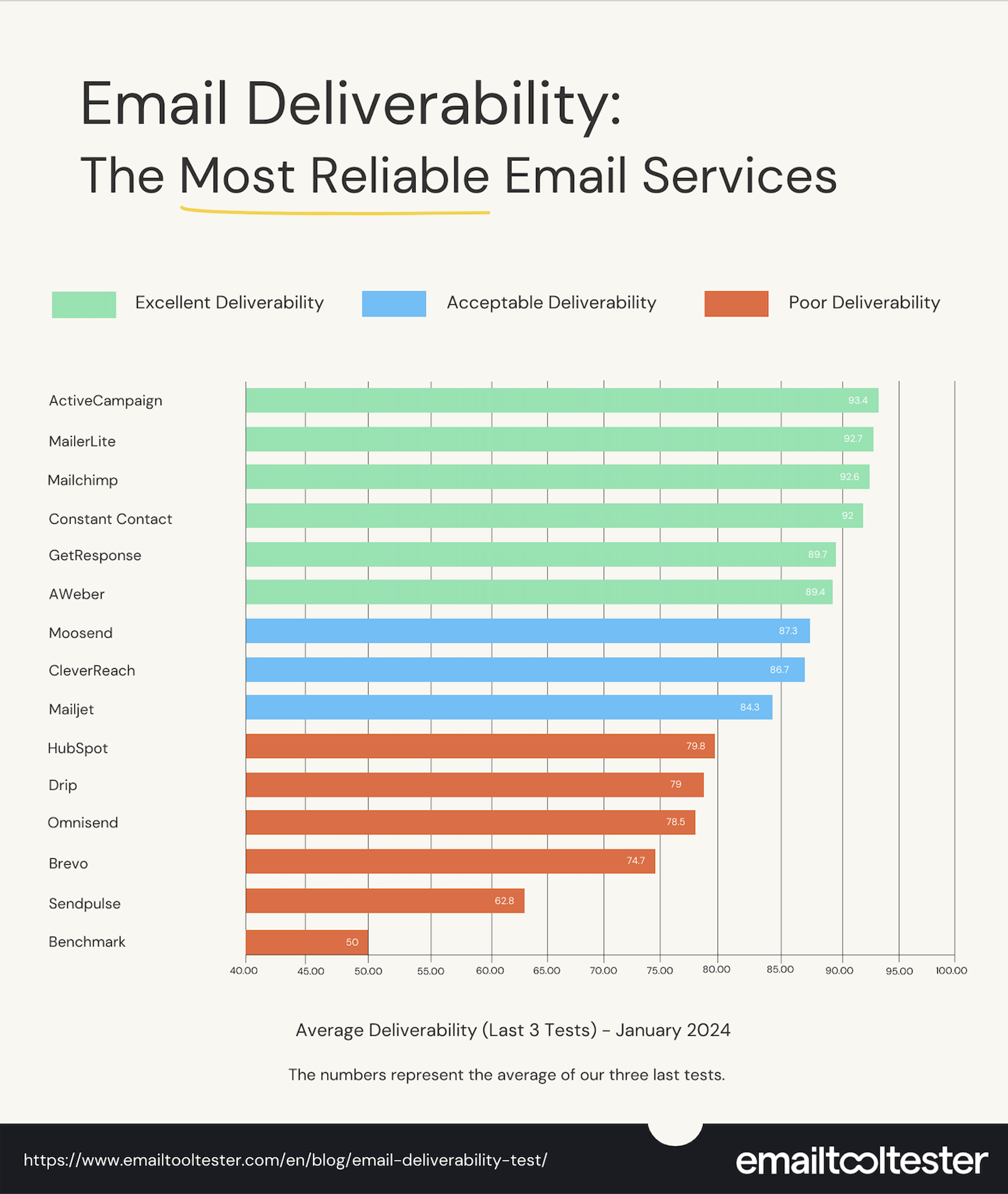 What good is your email campaign if nobody sees it? From the past three deliverability tests EmailTooltester ran this year, ActiveCampaign scored first over all other platforms with a 93.4% deliverability rate.
