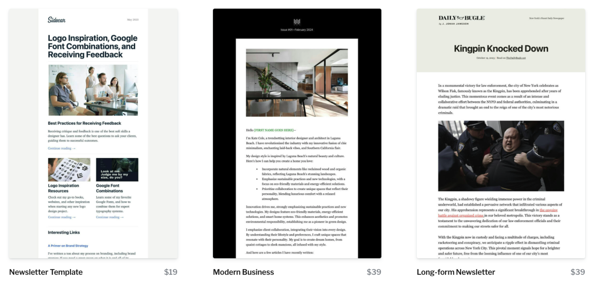 Kit doesn’t offer a large library of templates. Instead, it has a few minimal design themes focusing more on simplicity than visual flair.