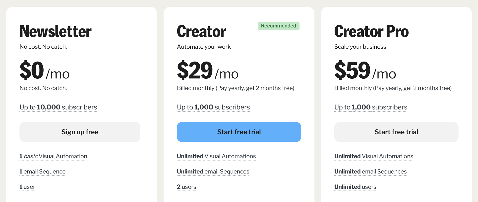 Kit’s entry-level pricing starts with their Creator plan which costs $29/month paid monthly for up to 1,000 subscribers.