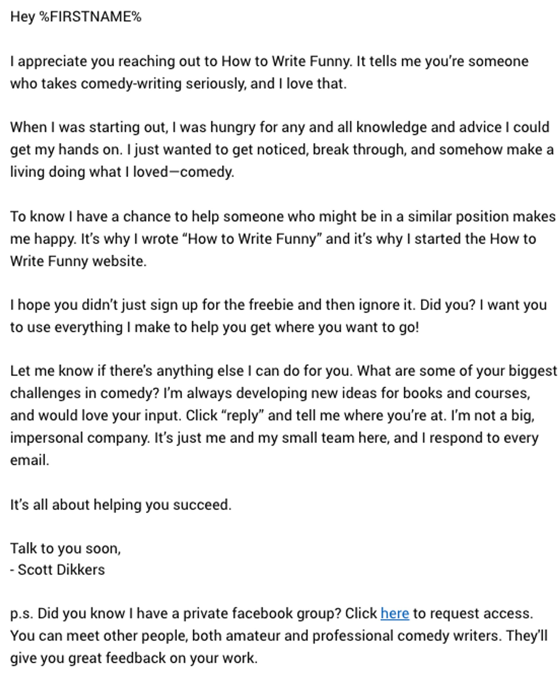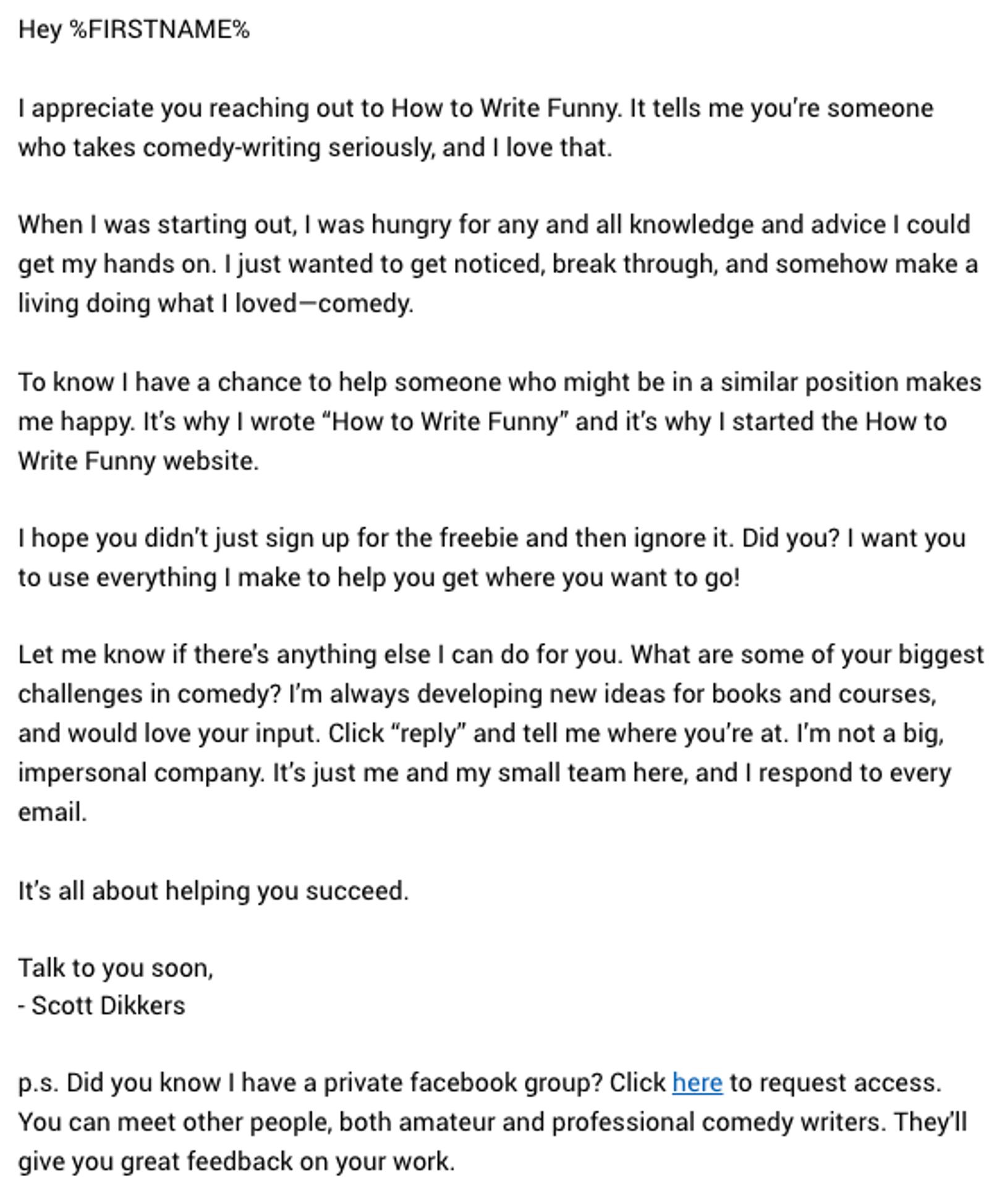 The first email also includes an invitation to a private Facebook group where Scott’s students can get feedback from other comedy writers.