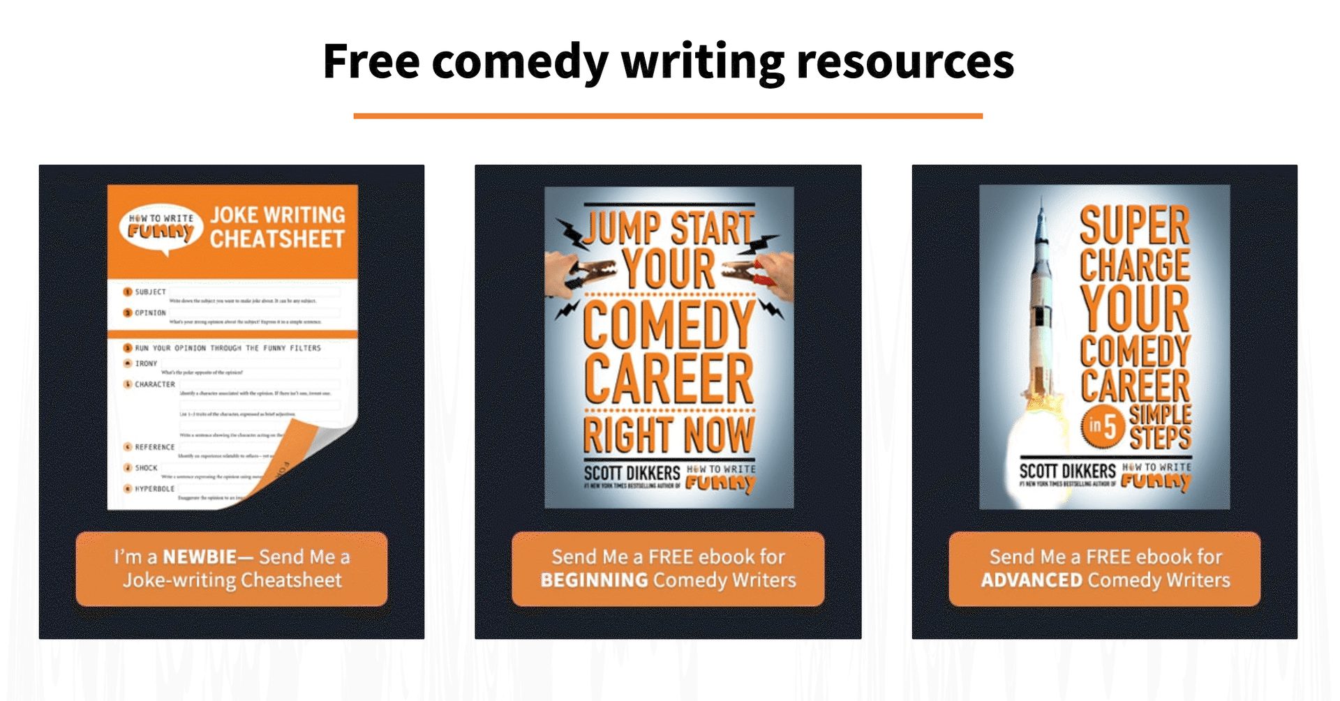 The downloads offer a taste of what Scott teaches in his classes (and his books). Most importantly, they offer visitors advice they can use right away — a lead magnet called the “joke-writing cheatsheet” promises results you can see in an afternoon.