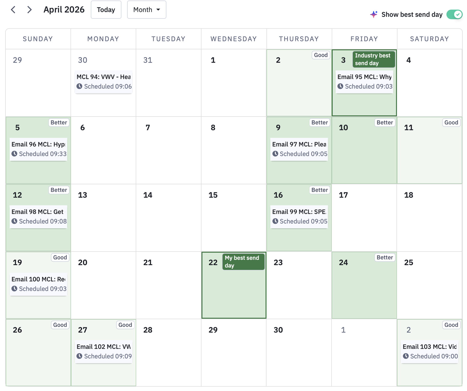 Baumgaertel maintains a twice-weekly email cadence, historically sending on Mondays and Thursdays. But rather than sticking to habit, she's now using ActiveCampaign's calendar view and Active Intelligence recommendations to optimize timing.