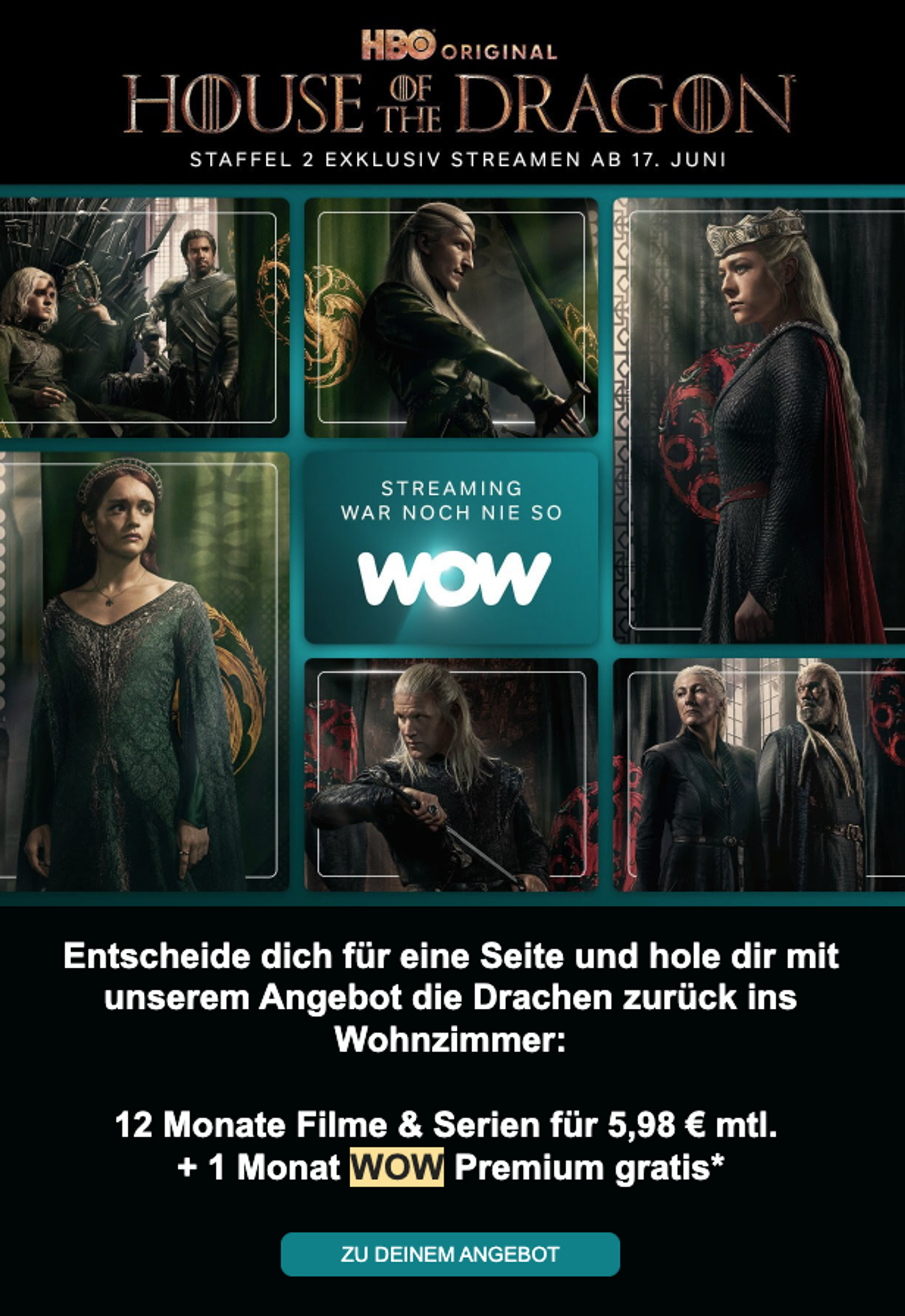 - Verwenden Sie einen verwandten Anreiz. Eine neue Staffel der Lieblingsserie plus das 12-Monats-Abo zum günstigeren Preis und 1 Monat Premium-Mitgliedschaft könnte WOW-Nutzer motivieren, sich mal wieder im Streaming-Angebot umzusehen.