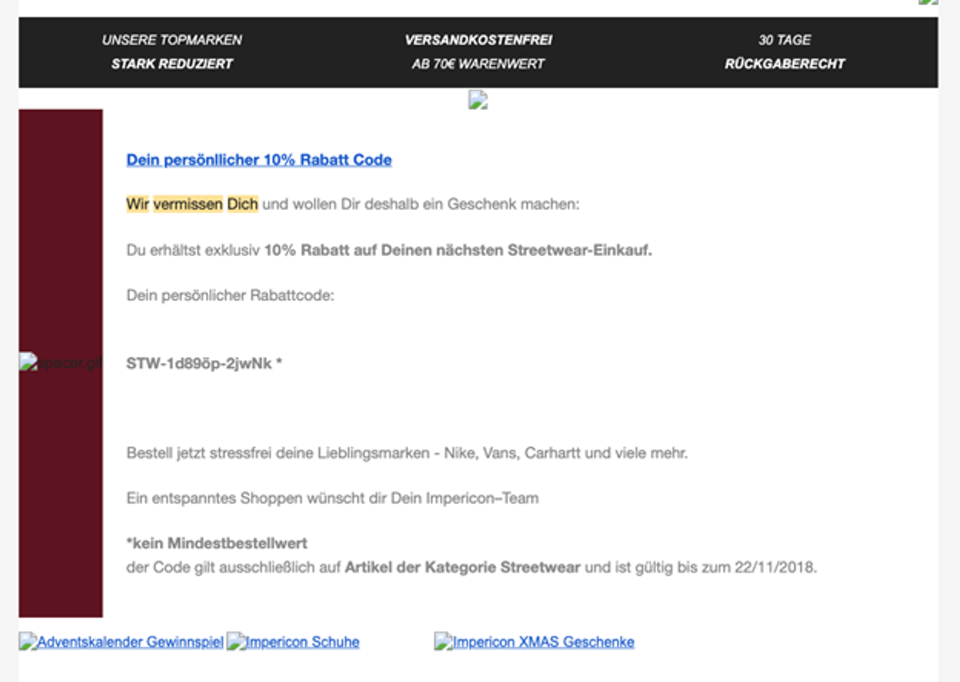 - Bieten Sie an, was die Kunden wirklich haben möchten – bei der Festlegung der Zielgruppe können Zielgruppenprofile helfen. Ist die Zielgruppe eher ungenau definiert, ist ein Rabattcode die optimale Wahl. Merchandising- und Bekleidungs-Anbieter Impericon bietet seinen Kunden die freie Auswahl, mit einem Rabattcode für ihren nächsten Einkauf.