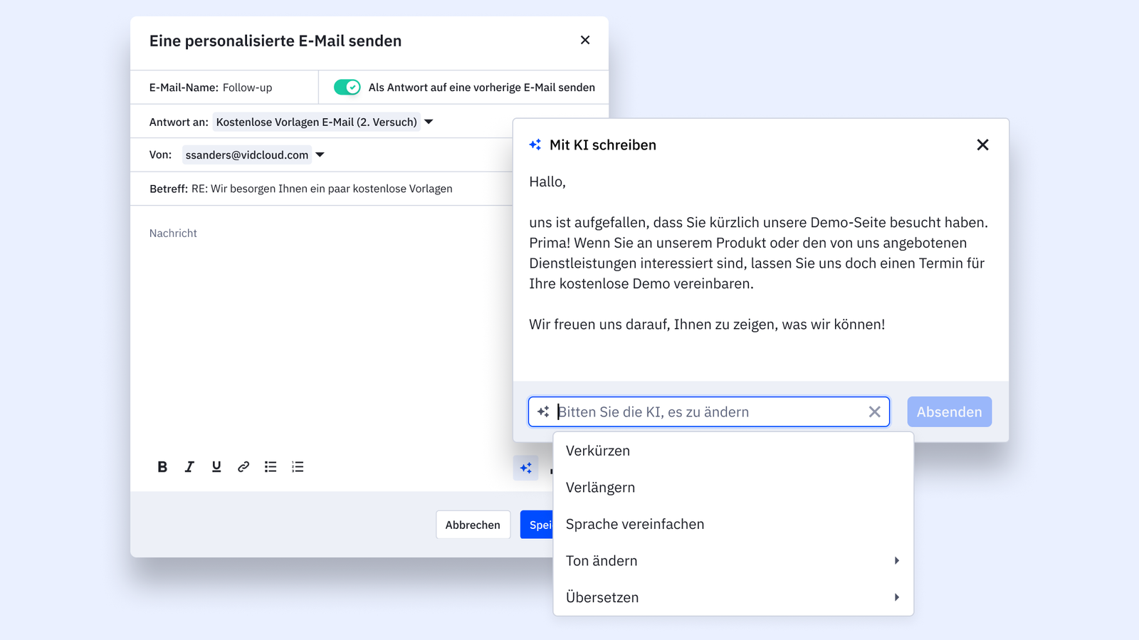 Neben der Verwendung von KI zur Generierung von E-Mail-Inhalten für deine Marketingkampagnen kannst du jetzt auch Inhalte für deine automatisierten, personalisierten Prospektierungs-E-Mails, gespeicherten Standardantworten und direkten personalisierten E-Mails generieren, die über verbundene-E-Mail-Konten versendet werden. Das spart dir wertvolle Zeit und Mühe.