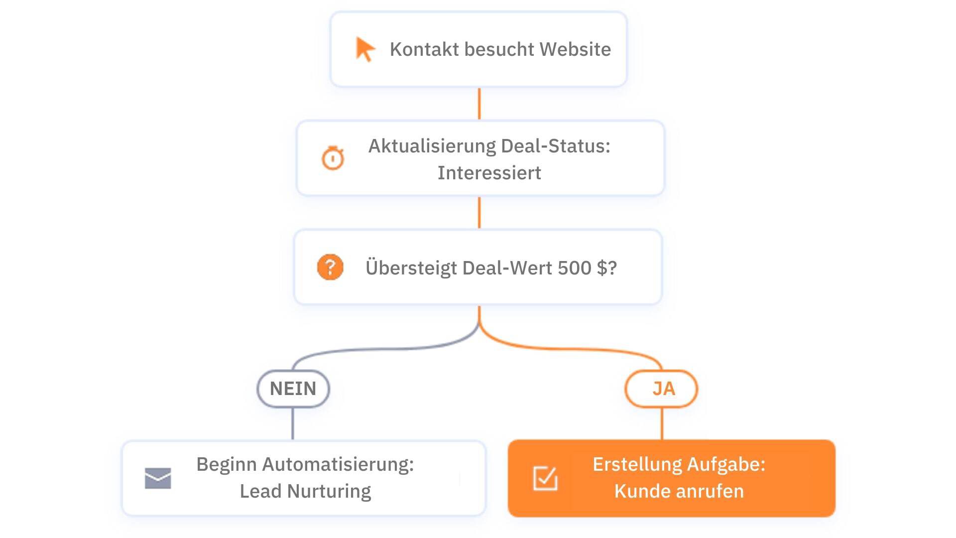 Wenn der Wert des Deals über 500 $ liegt, ordnet das CRM automatisch einem Sales-Mitarbeiter die Aufgabe der telefonischen Kontaktaufnahme zu. Wenn der Wert des Deals weniger als 500 $ beträgt, wird der Lead automatisch einer Lead-Nurturing-Kampagne zugeordnet.