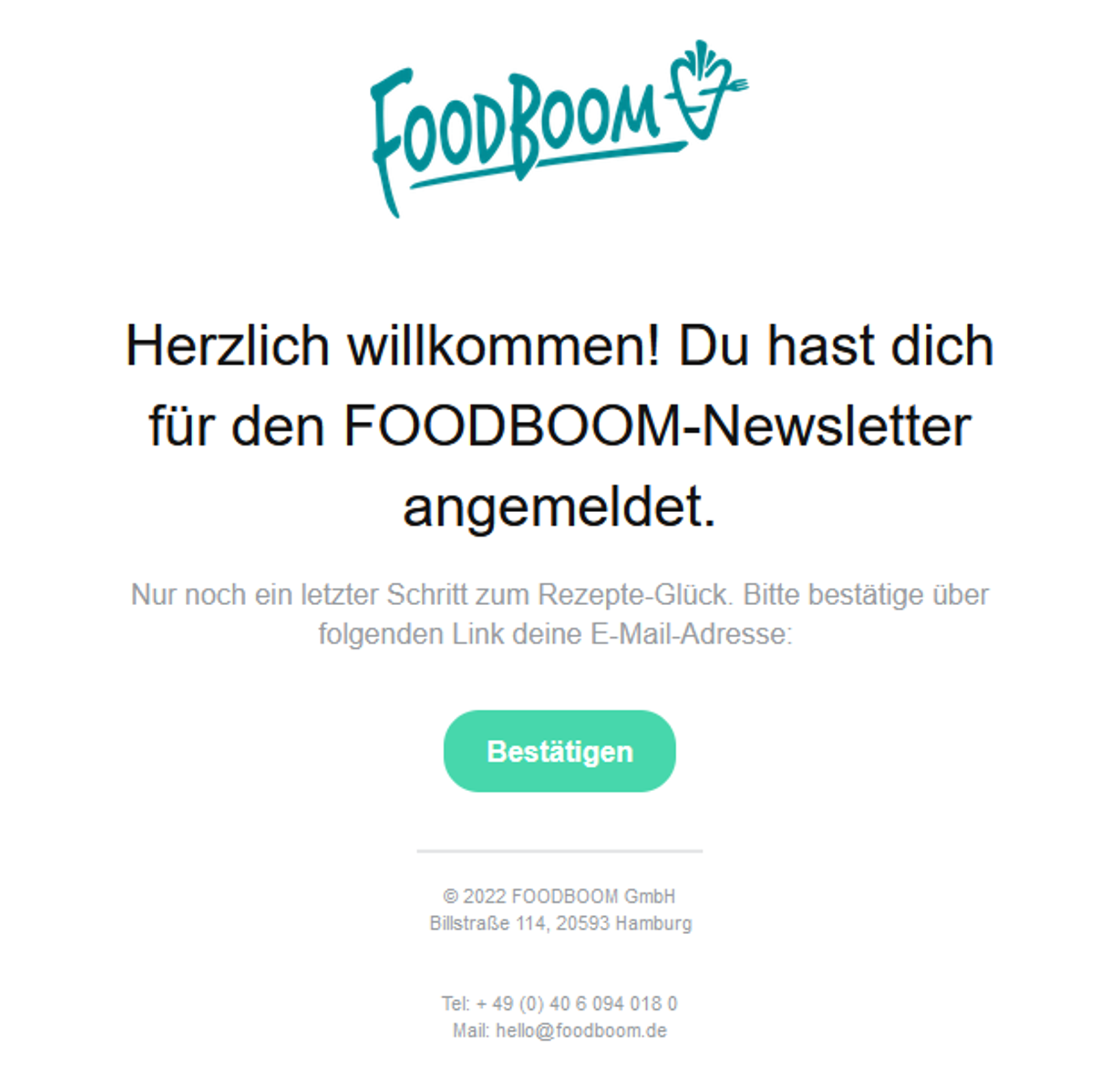 Nachfolgend findest du ein solches Opt-in-Beispiel für die Bestätigung zur Anmeldung eines Newsletters. Auf diese Weise stellt die deutsche Food Marketing-Agentur Foodboom sicher, dass der Eigentümer der E-Mail-Adresse wirklich am Erhalt ihrer E-Mails interessiert ist.