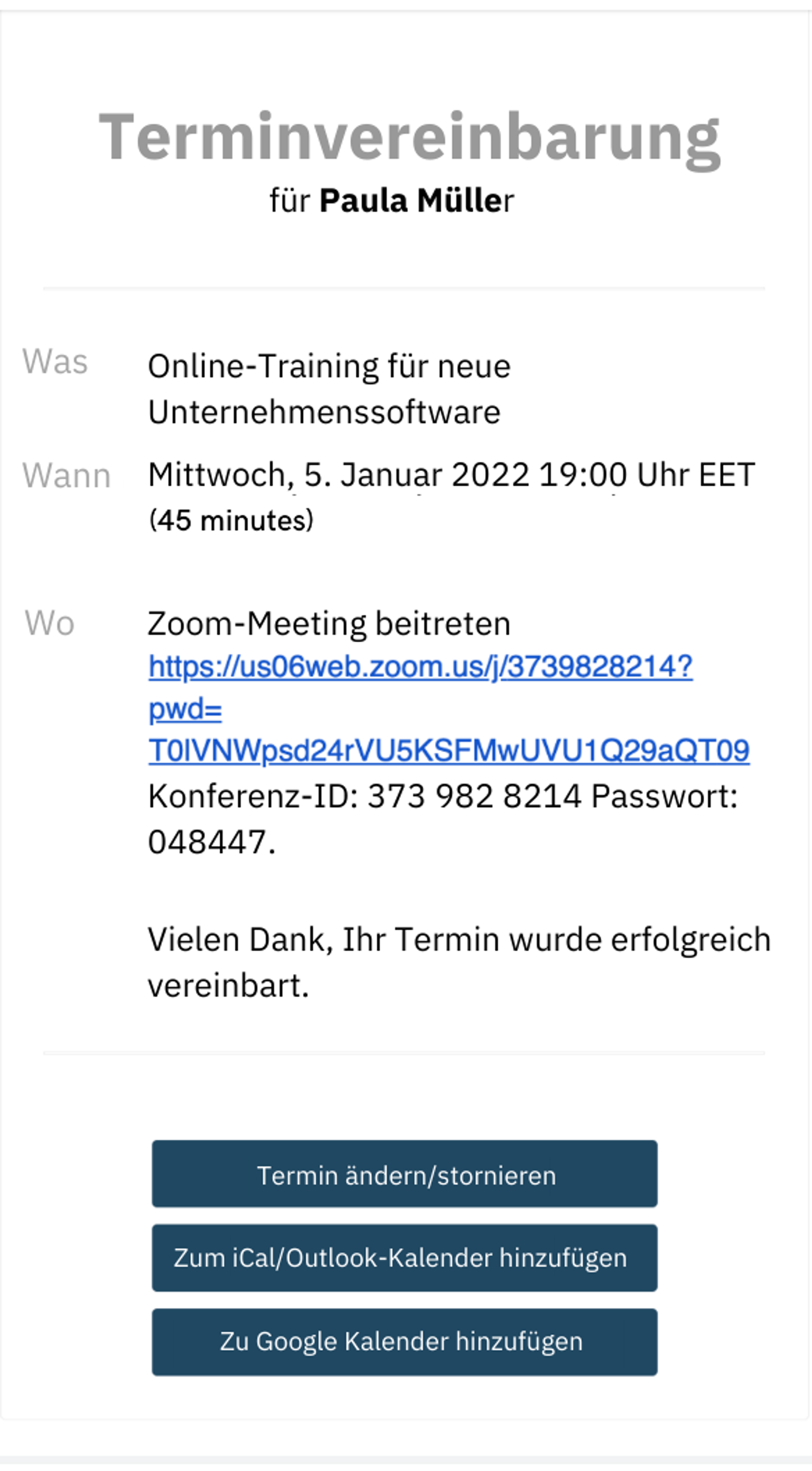 Eine Termin-Bestätigungsmail wird nach einer Terminvereinbarung gesendet. Sie enthält normalerweise alle wichtigen Daten für den vereinbarten Termin.