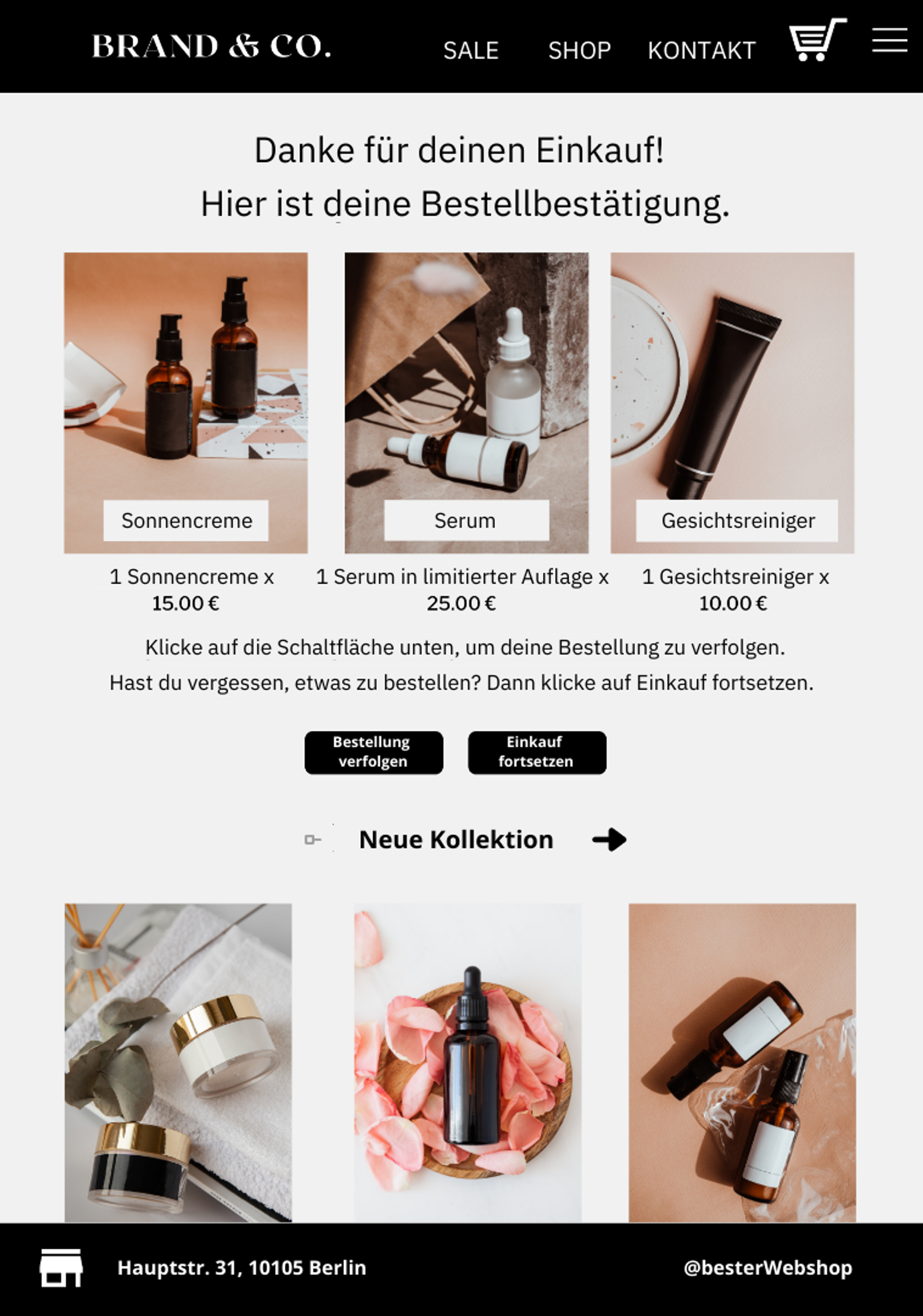 Wer kennt das nicht: Man erhält eine Bestellbestätigung per E-Mail, die die allerwichtigsten Informationen überhaupt nicht enthält. Das ist super frustrierend! Stelle daher sicher, dass deine Bestätigungsmail Abbildungen und Bezeichnungen der bestellten Produkte enthält.