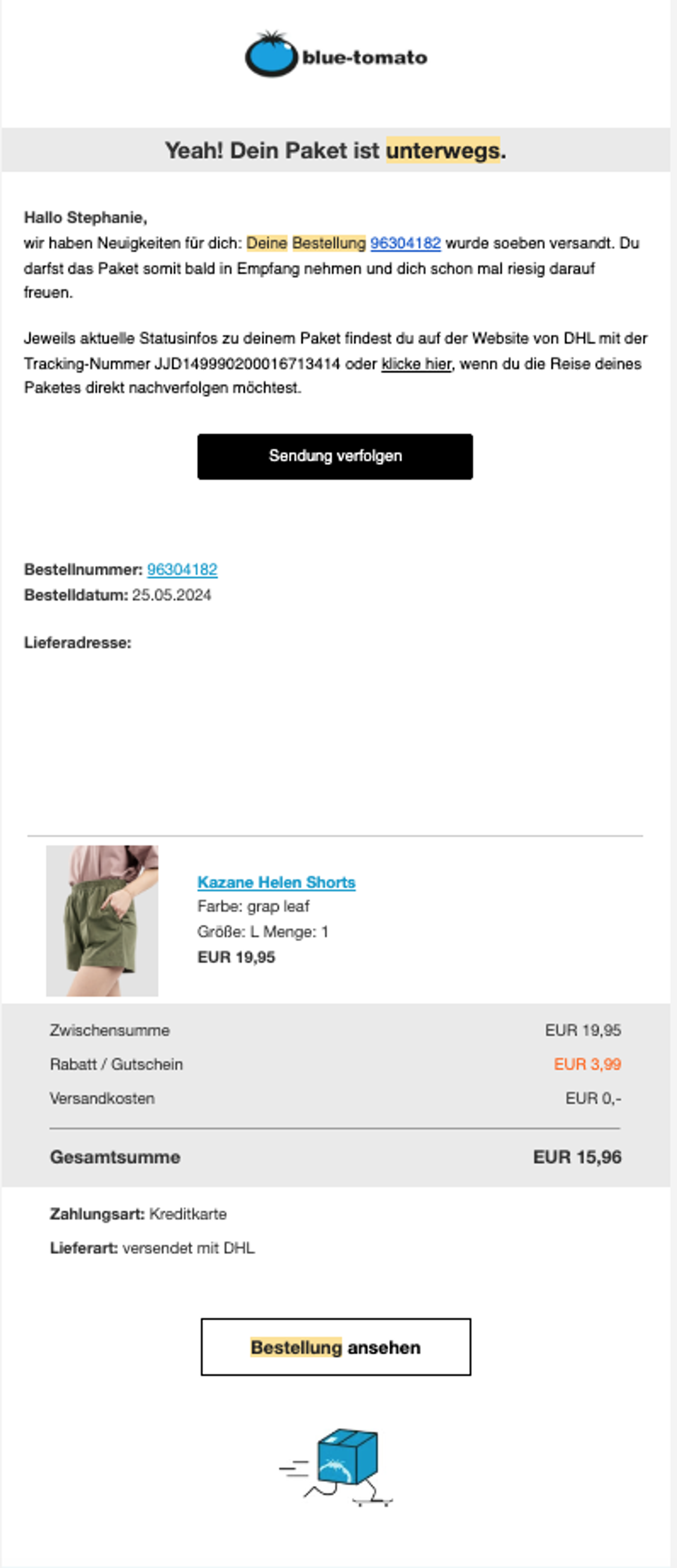 Nachdem die Bestellbestätigungs-E-Mail Kunden über den Eingang ihrer Bestellung informiert hat, hält die Versand-Bestätigungsmail die Kunden über den Bearbeitungsfortschritt sowie den Versand auf dem Laufenden. Oft enthält sie auch eine Tracking-Nummer des Versanddienstleisters.
