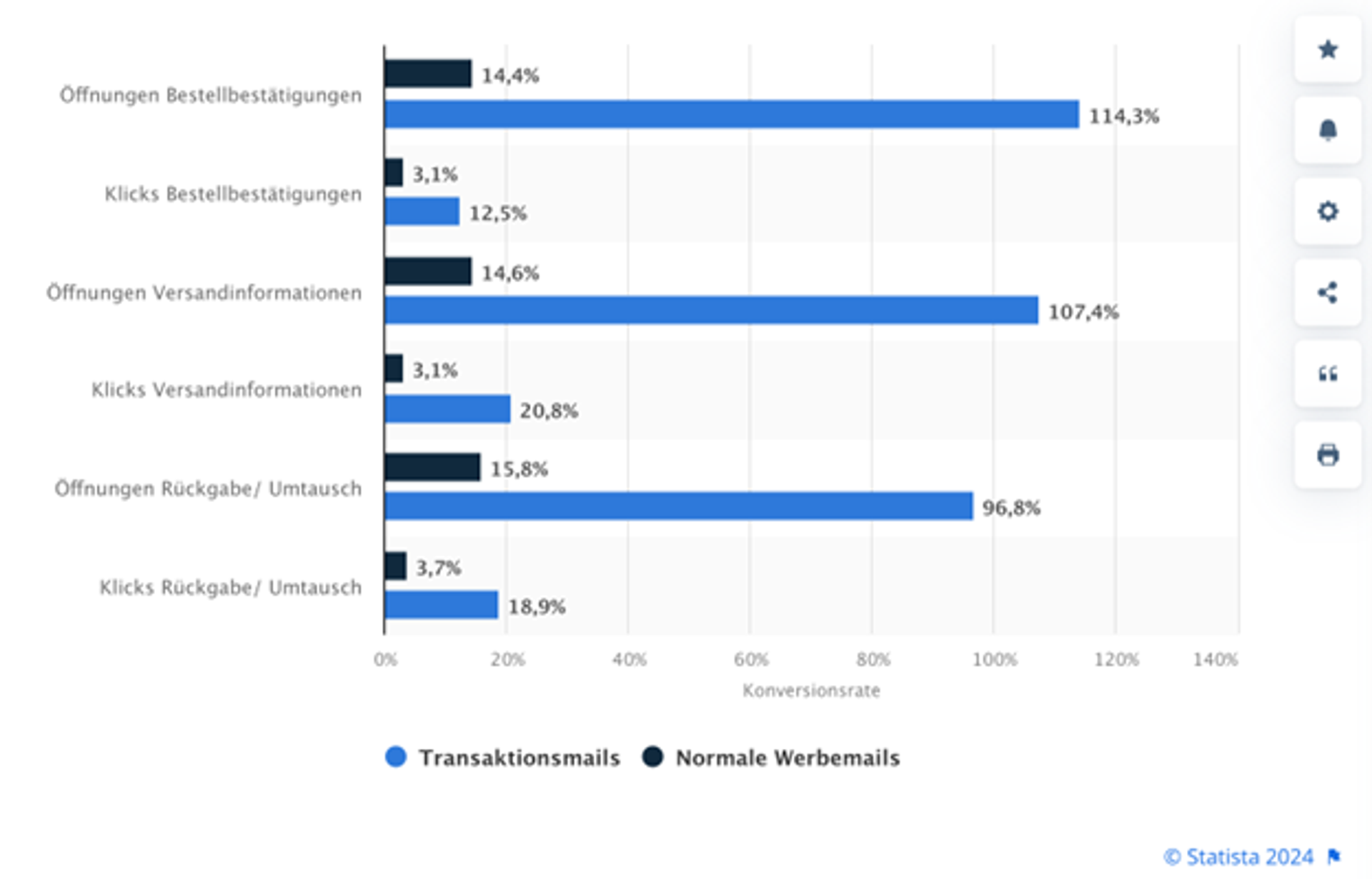 (Alt: Laut Statista ist die Öffnungsrate bei Transaktionsmails bis zu zehnmal höher als bei anderen Werbemails (Quelle: Statista).)