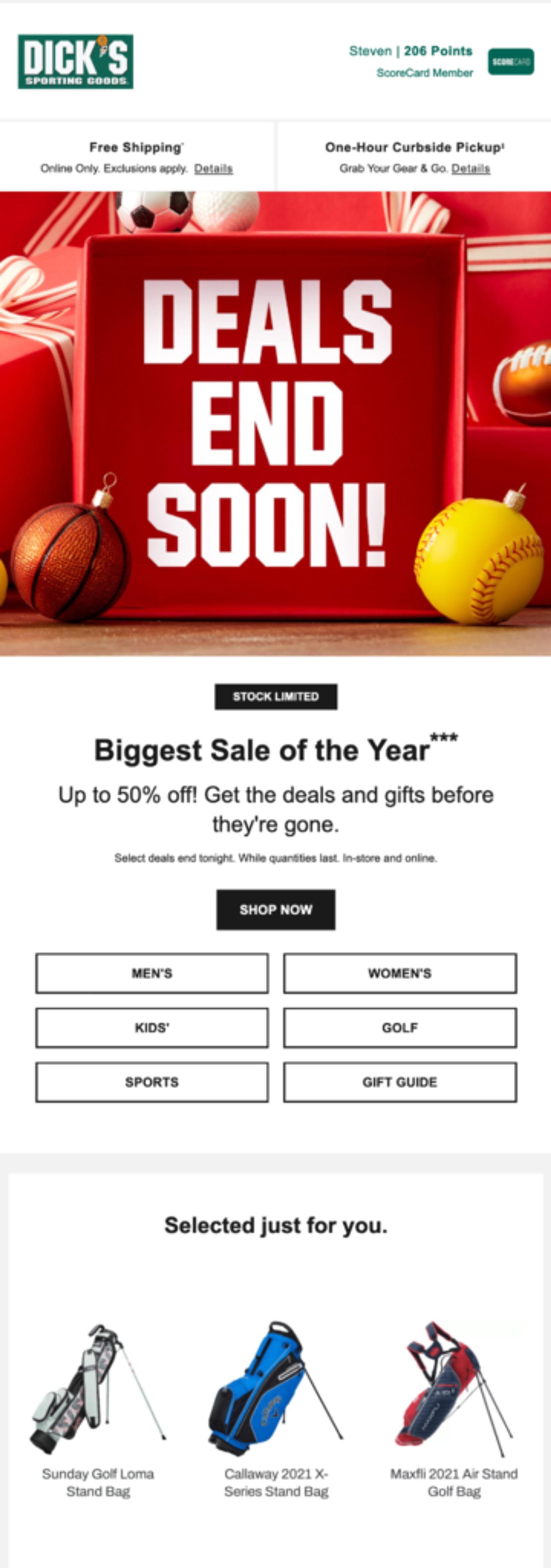Diese E-Mail mit den Black Friday Deals von Dick's Sporting Goods wirbt nicht nur für den größten Verkauf des Jahres, sondern ist auch sehr gut personalisiert. Die Zielgruppe in dieser Werbe-E-Mail sind Golfer. Um die Relevanz zu erhöhen, wurden daher Golftaschen und eine Golf-Kategorie hinzugefügt.
