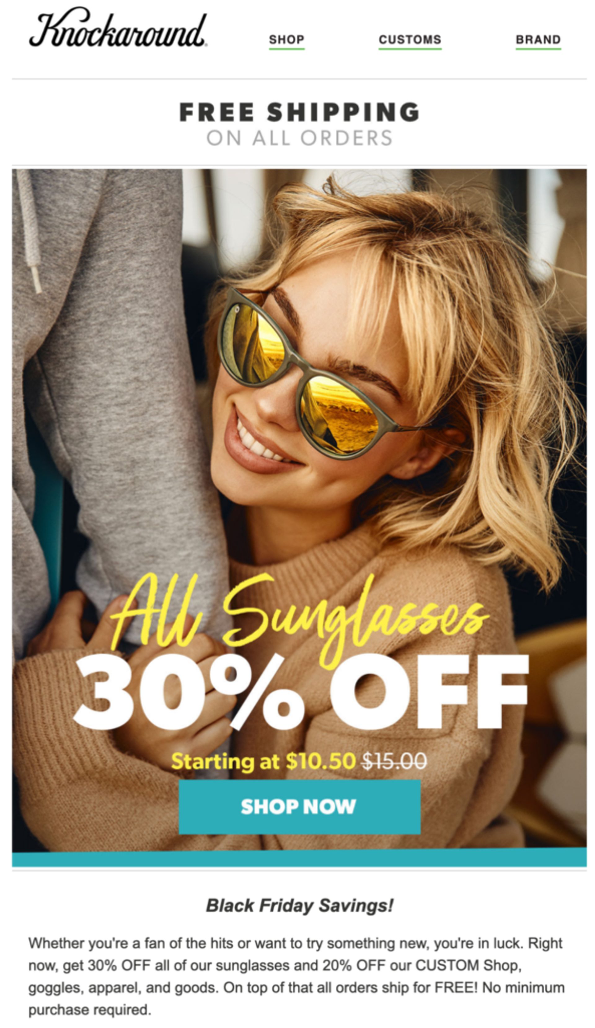 Knockaround zeigt eine fantastische Aufnahme einer ihrer Sonnenbrillen zusätzlich zu einer schönen Grafik und einem klaren Angebot. Dies ergibt ein viel ansprechenderes Bild, als wenn man nur ein Foto der Sonnenbrille sehen würde.
