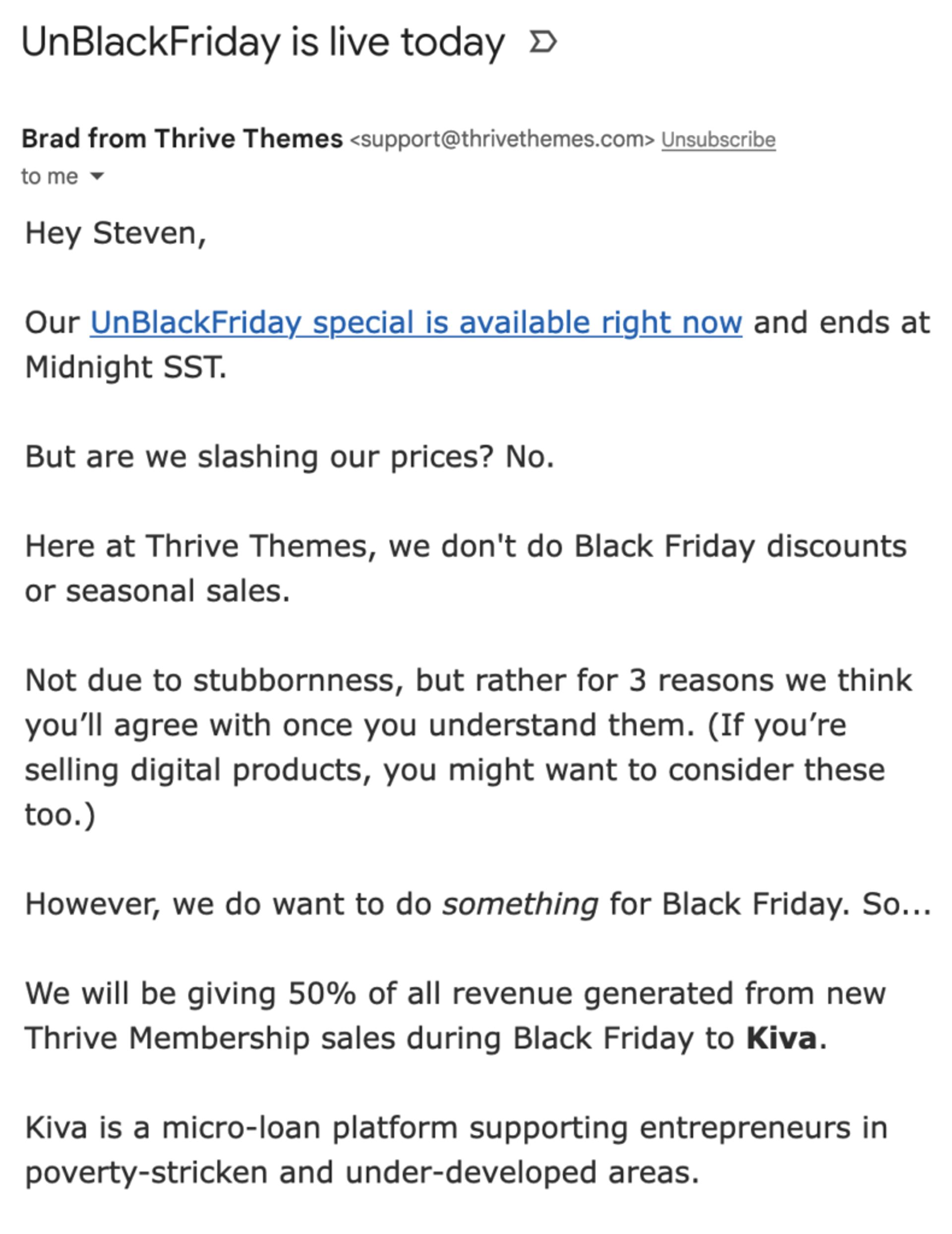 Eventuell widersprechen die Black Friday-Verkäufe deinem Geschäftsmodell. In diesem Beispiel teilt der ActiveCampaign-Kunde Thrive Themes sein „UnBlackFrida“-Special.