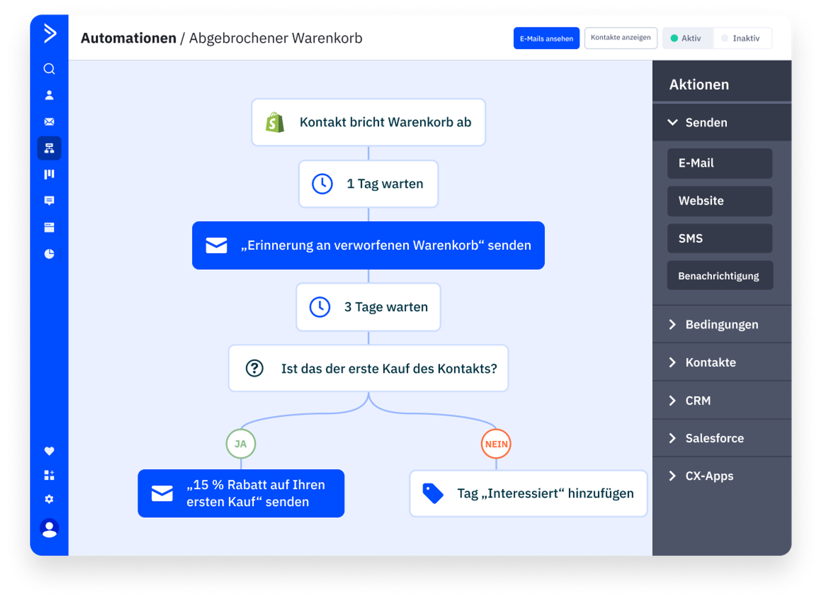 - Automatisiere Follow-ups: Richte automatisierte Follow-up-E-Mails für abgebrochene Warenkörbe, Produktempfehlungen und Feedback nach dem Kauf ein, um potenziell verlorene Umsätze zurückzugewinnen und die Kundenzufriedenheit zu erhöhen.