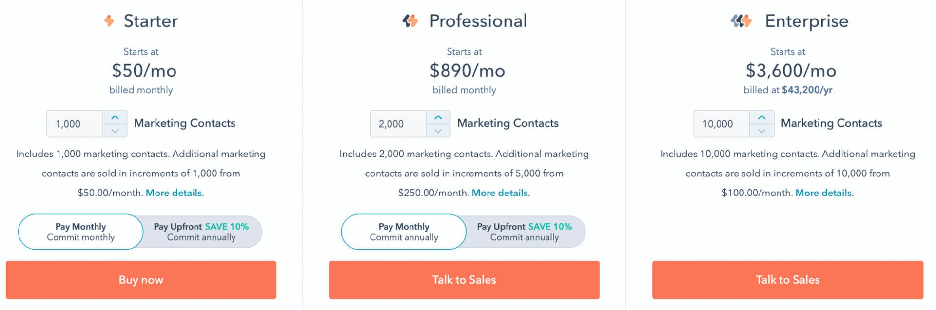 Das größte Problem bei der E-Mail-Marketing-Plattform von HubSpot sind die Kosten. Es sind 3 Jahrestarife verfügbar: Starter, Professional und Enterprise. Wenn du davon ausgehst, dass deine E-Mail-Listen insgesamt nicht mehr als 5.000 Kontakte umfassen, belaufen sich deine monatlichen Kosten auf etwas mehr als 1.000 USD, die du jährlich bezahlen musst.