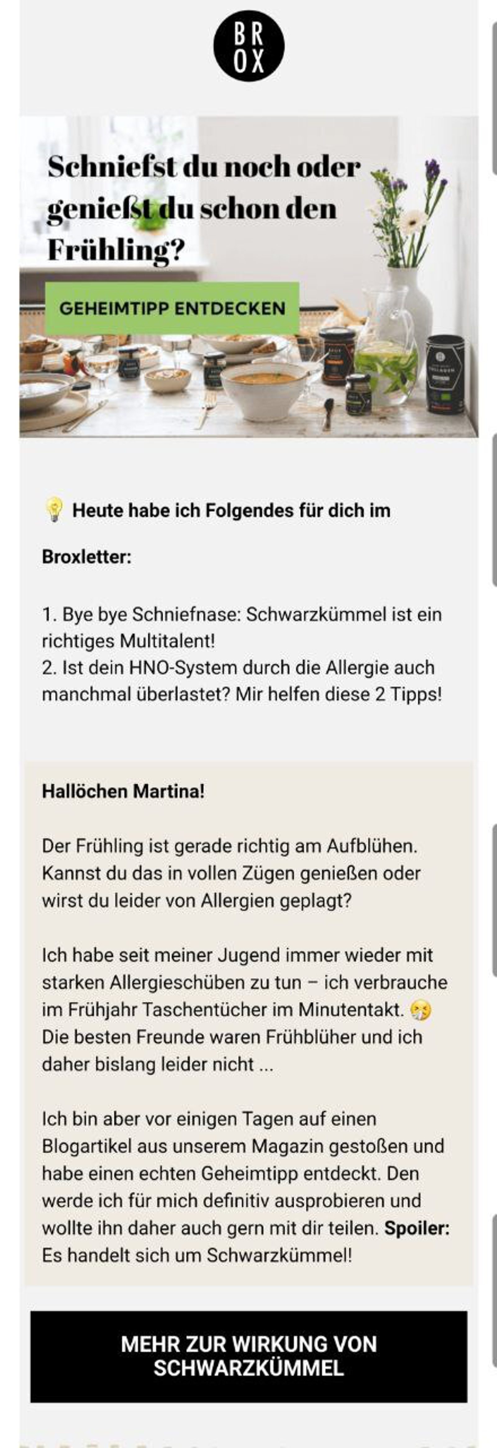 Dieser Newsletter des Knochenbrühen-Herstellers Bone Brox spricht ein Thema an, das viele Deutsche im Frühjahr quält: Heuschnupfen.