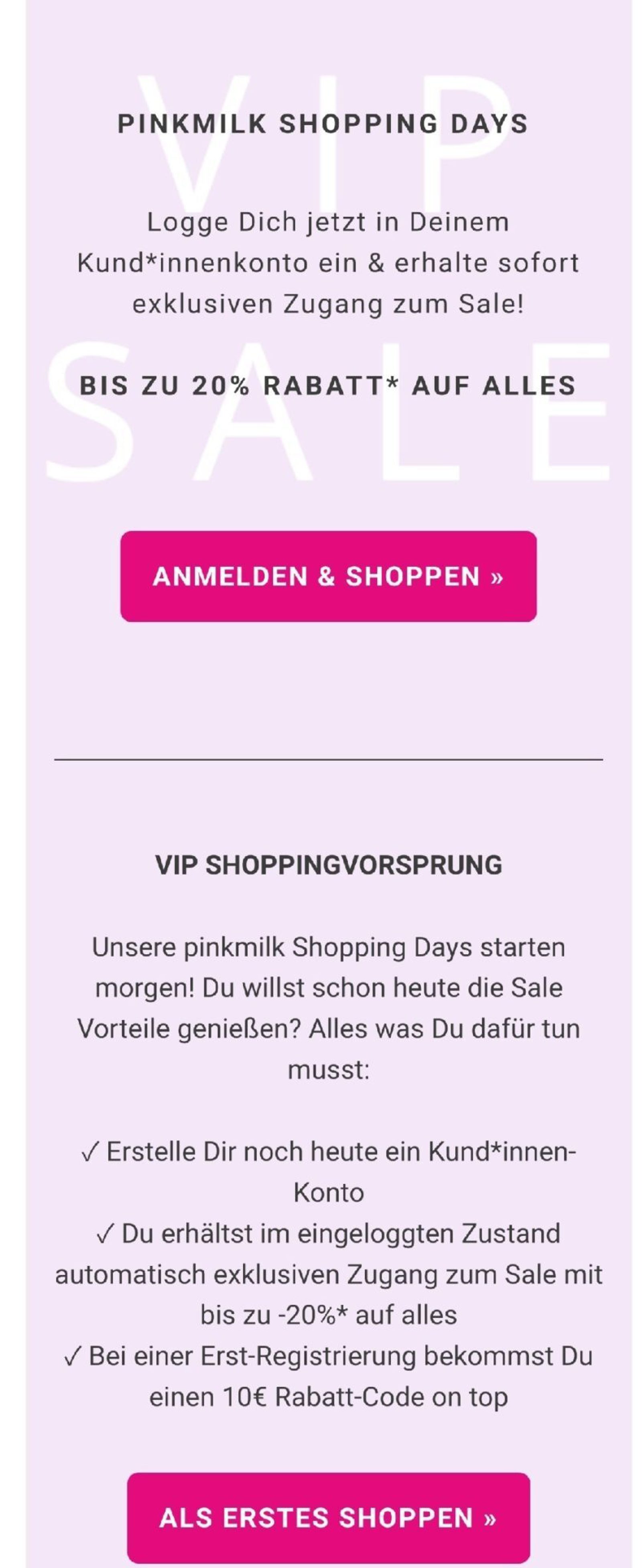 Ich stöbere online gerne nach neuen Deko-Ideen für mein Zuhause. Hier ist ein Beispiel für eine Werbe-E-Mail des Interior-Shops pinkmilk. Sie wurde exklusiv an VIP-Kunden wie mich geschickt: