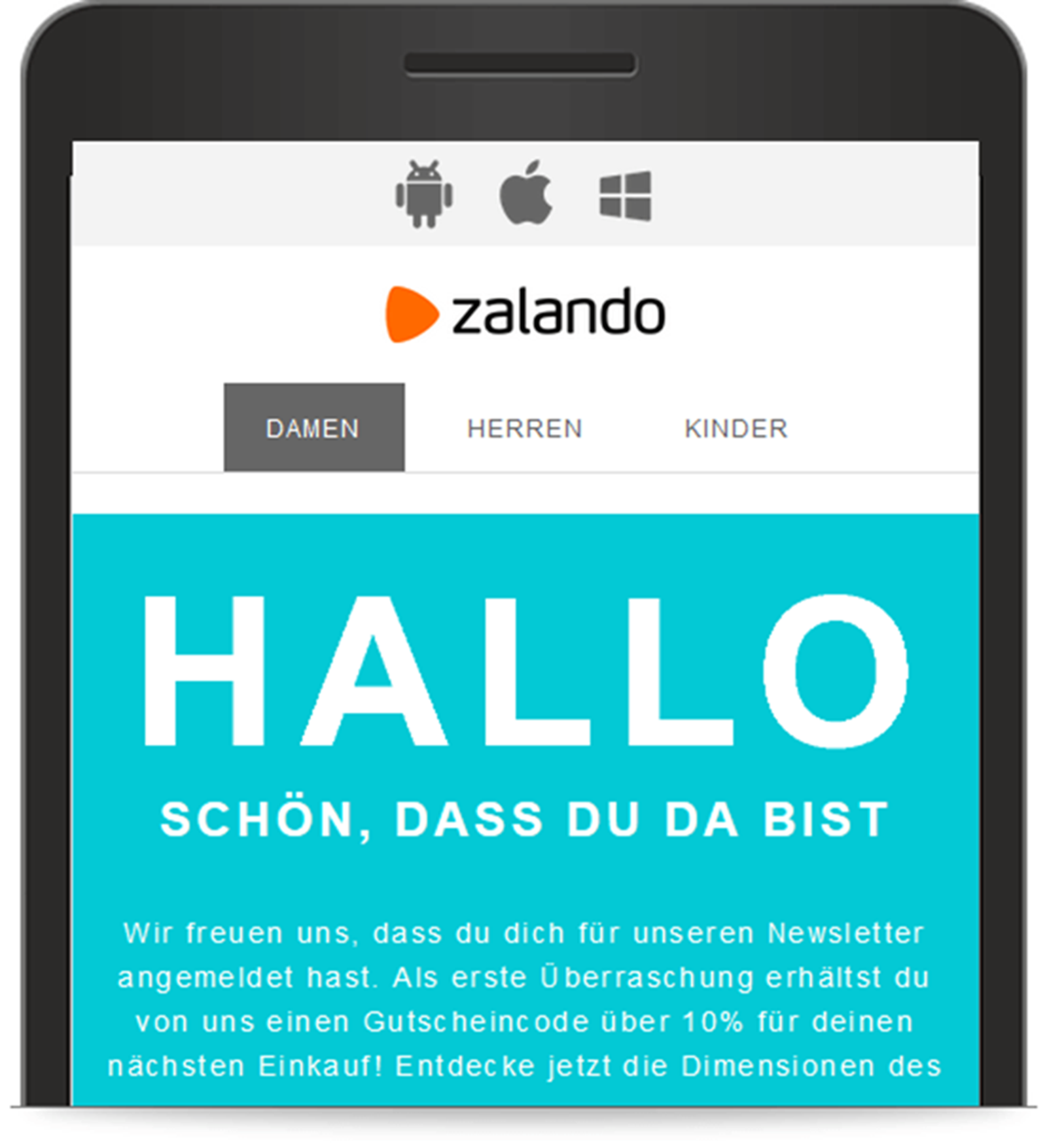 Zalando macht es uns gut vor. Öffnet man die Mail, so wird man direkt willkommen geheißen. Ohne nach unten scrollen zu müssen, bekommt man auf den ersten Blick alles Wichtige zu sehen. Die Farben heben sich dabei gut ab, sodass man die wichtigsten Worte schnell erkennen kann. Groß und deutlich kann der Kunde zuerst „Hallo – schön, dass du da bist“ lesen. Er wird dadurch persönlich angesprochen, was ein Wohlgefühl auslöst und Lust macht, weiter zu stöbern.