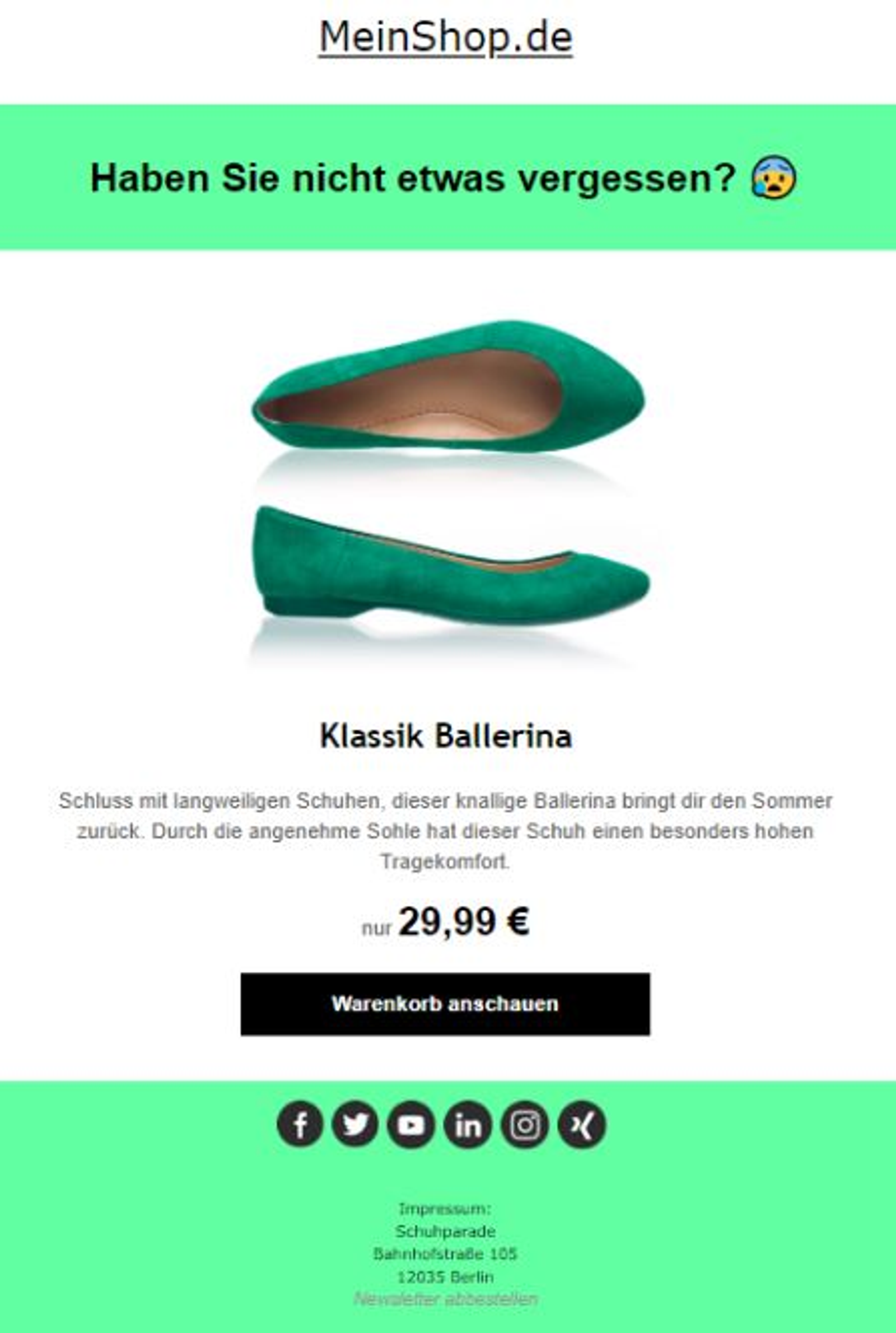 Wie oft kommt es vor, dass ein Kunde die Produkte anschaut und sogar in den Warenkorb verschiebt, aber den Kauf nicht abschließt? Da kommt eine Erinnerungsmail genau richtig, die darauf hinweist, dass der Artikel noch zum Kauf bereitliegt.