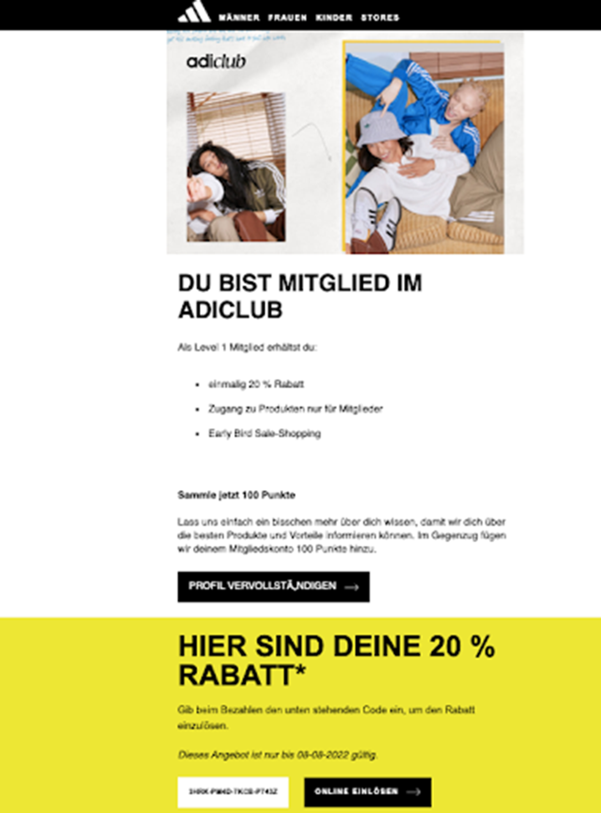 Die Sätze „Du bist Mitglied im Adiclub — Sammle jezte 100 Punkte“ sind dabei besonders schlau gewählt, denn schließlich möchten wir alle besondere Vergünstigungen bekommen. Über die Schaltfläche geht der Einlösung des zeitlich begrenzten Rabatts schnell und ohne Umwege.
