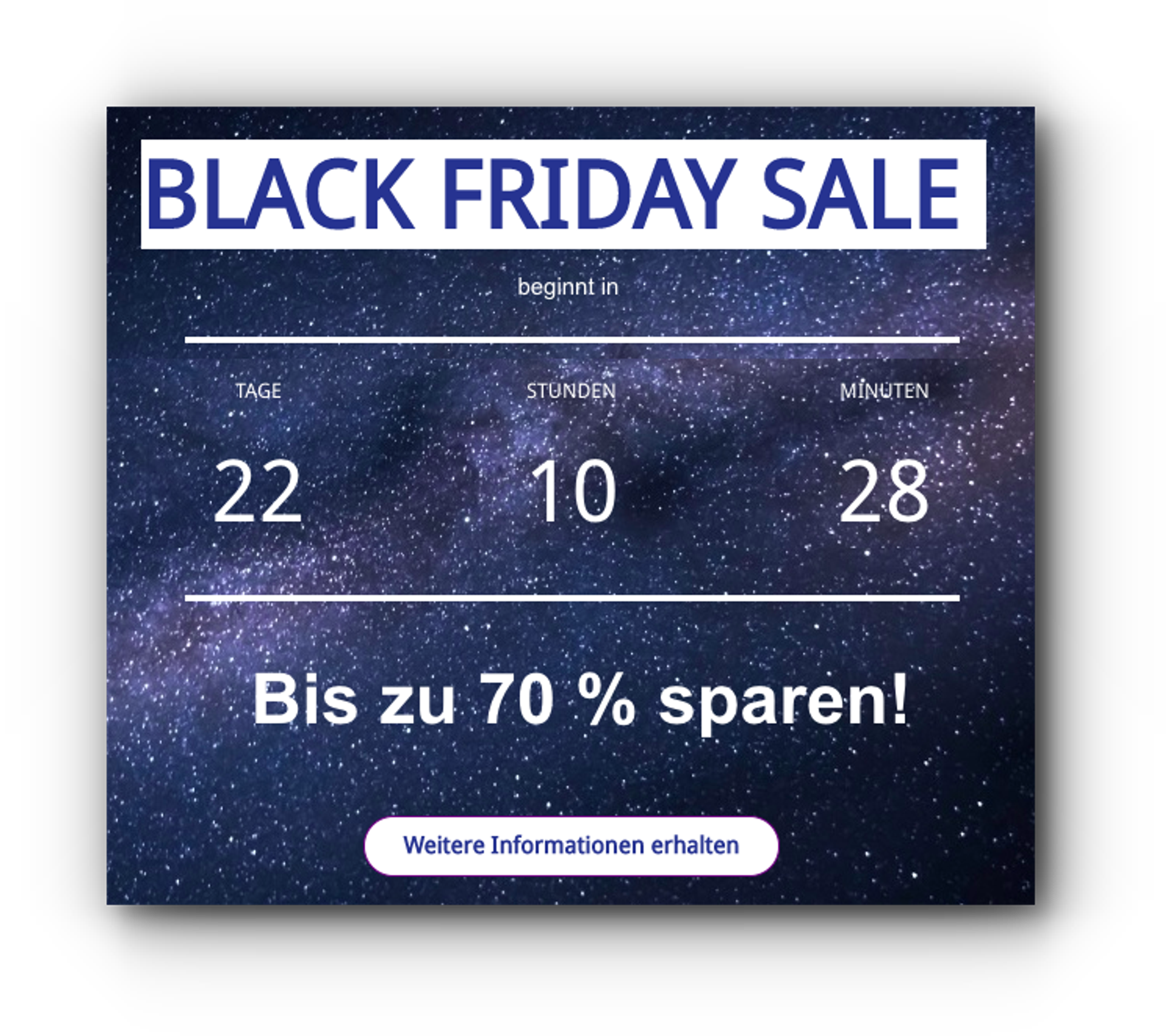 Der Timer könnte auch als Link funktionieren und den Kunden auf die eigentliche Homepage oder auf Landingpages bringen, die unmittelbar verknüpft wären. Förderlich kann es zusätzlich sein, die Wörter stets wörtlich zu nehmen. Der Black Friday wird hier zum Beispiel mit einem dunkelen Hintergrund unterstützt. Der visuelle Eindruck spielt eine wichtige Rolle.