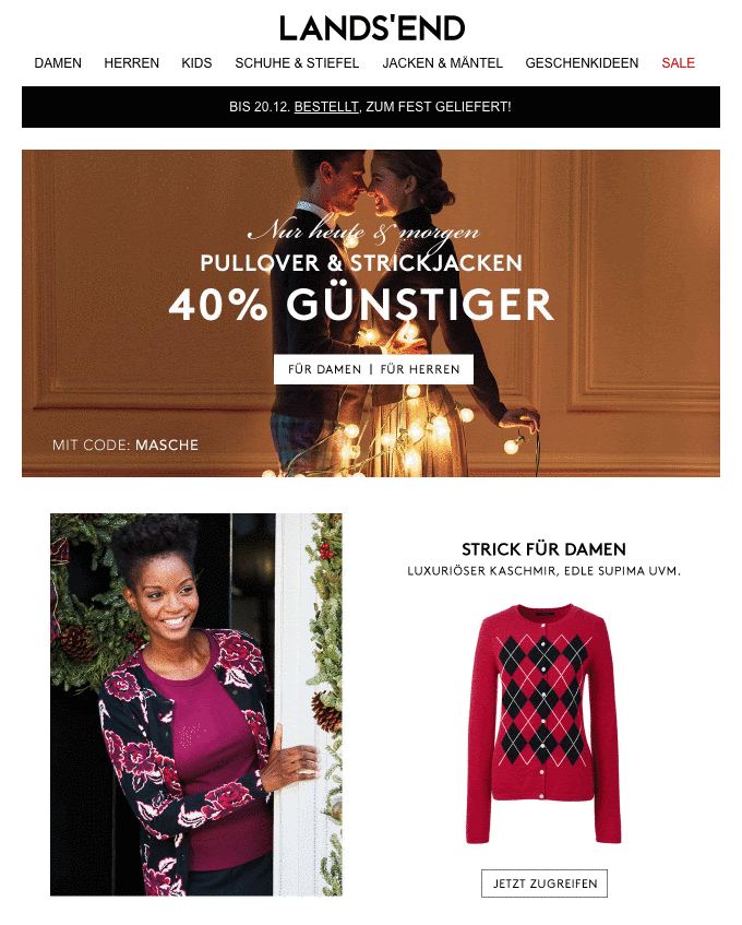 Bunte Farben, eine schöne animierte Auswahl und das Angebot auf den ersten Blick wecken das Interesse eines jeden Lesers. Newsletter-Marketing beruht auf optischen Highlights, die vor allem auch durch GIFs gegeben sind. Die animierte Pullover direkt über dem CTA wirken nicht nur amüsant, sondern geben auch das Gefühl, sich schnell entscheiden zu müssen.
