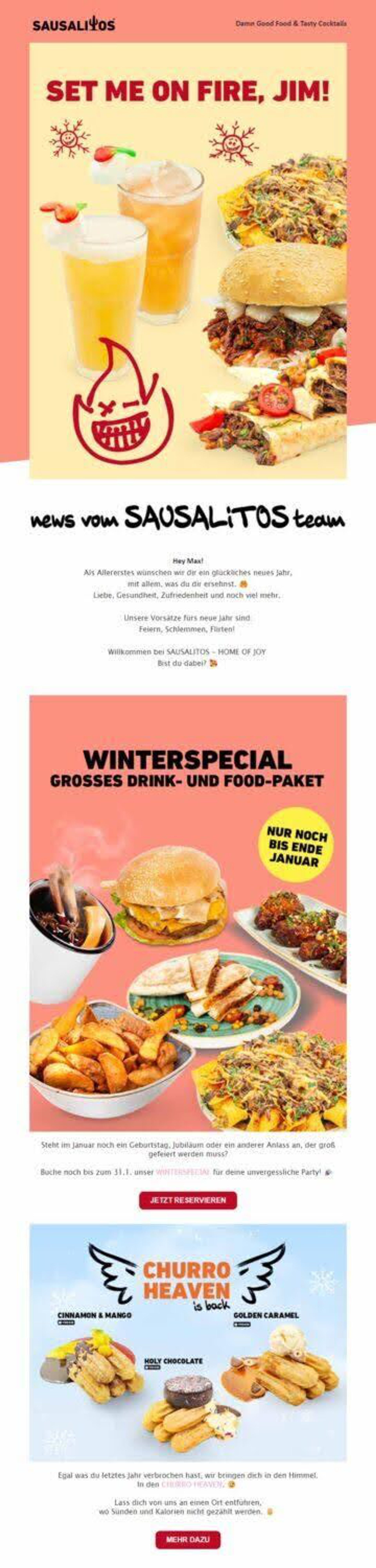 In dieser E-Mail wurde zusätzlich die Möglichkeit geboten, eine Party zu buchen, bzw. mehr über ein Menu zu erfahren. Die Food-Fotografie kann hier mit allen Sinnen wahrgenommen werden, sodass man automatisch dazu geleitet wird, die Schaltflächen zu nutzen.
