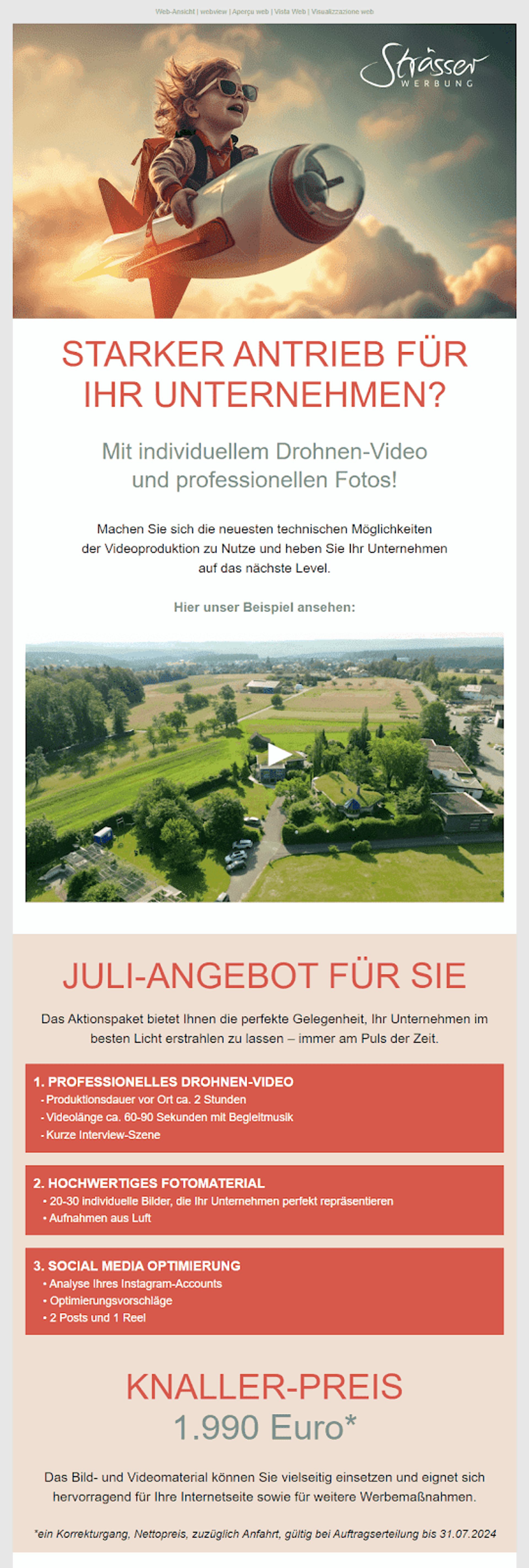 Hier ist ein gelungenes Beispiel dafür, wie man verschiedene Visuals zusammenfügen kann. Nicht nur das Headerbild und der Untertitel, die beide direkt zur Website führen, wecken das Interesse, sondern zusätzlich die Möglichkeit, ein Video einzusehen, welches die professionellen Ergebnisse des Unternehmens präsentiert. Es fällt auf, dass die Angebot-Details direkt unter dem Videostandbild außerdem sagt, dass man einen Rabatt angeboten wird, was verlockend für alle Leser ist.