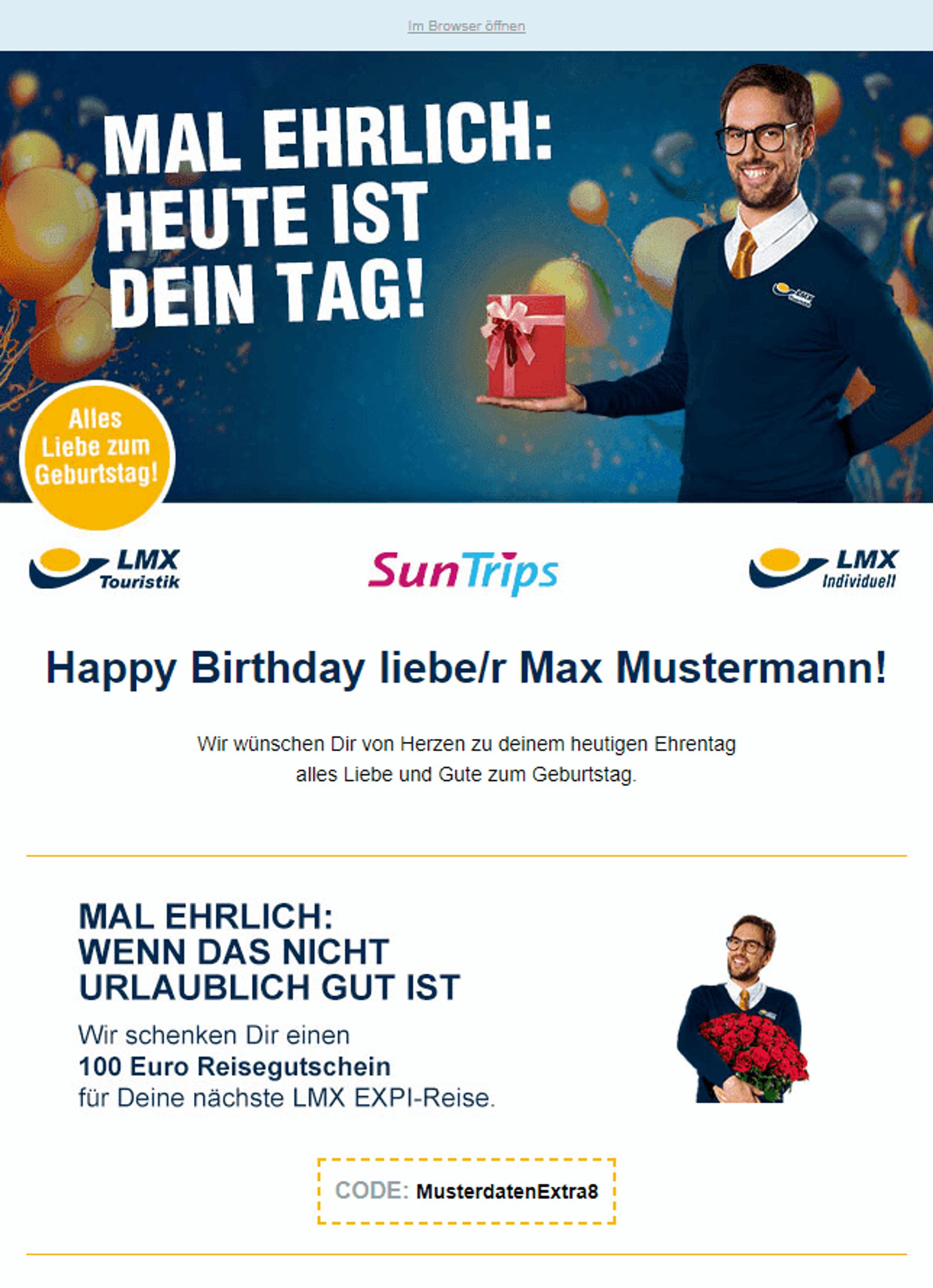 Wichtiger als eine allgemeine Verkaufsförderung zu senden, ist es, Interesse am Kunden zu zeigen. So wird in dieser Mail die persönliche Ansprache genutzt, um den Abonnenten zum Geburtstag zu gratulieren. Auch der Reisegutschein, der mit den vorherigen Buchungen des Kunden zusammenhängt, führt dazu, dass die Website wieder besucht wird.