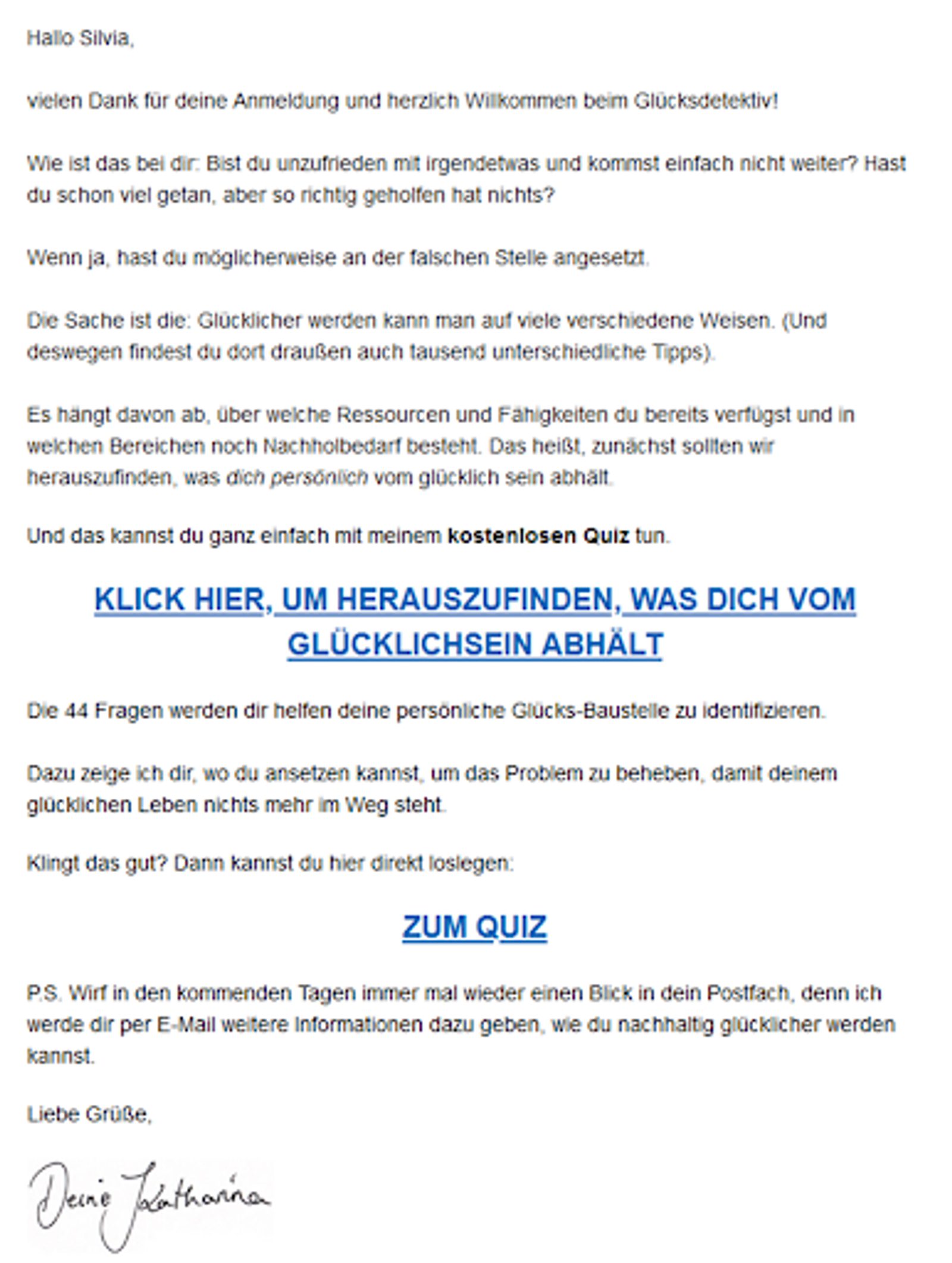 Nicht alle Willkommens-E-Mails erzielen ein hohes Engagement, aber diese E-Mail mit Quiz tut das sicherlich. Unternehmen sollten ihre Willkommens-E-Mails dafür nutzen, um ihren Leads oder Kunden relevante Inhalte anzubieten, so wie Katharina.