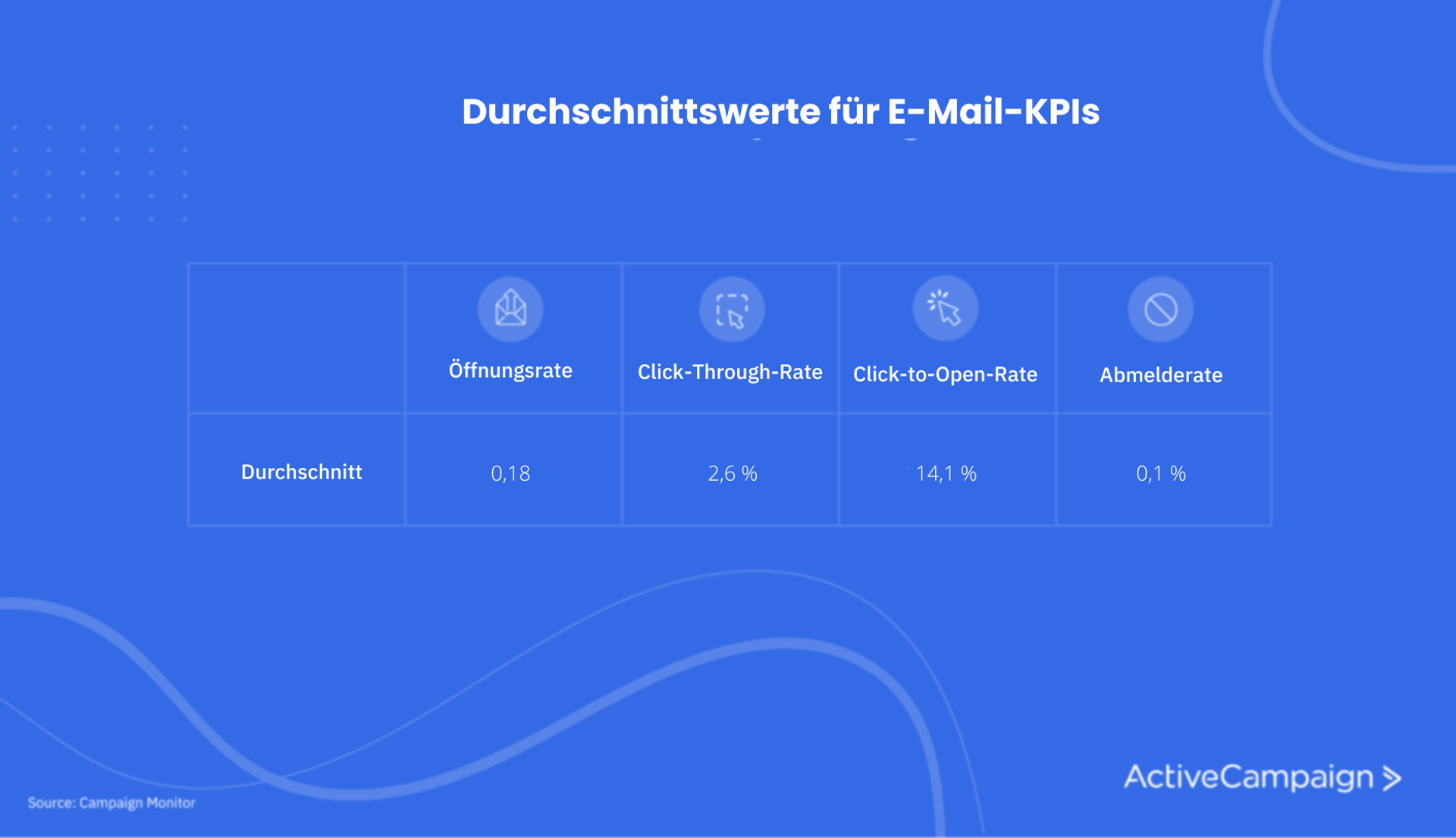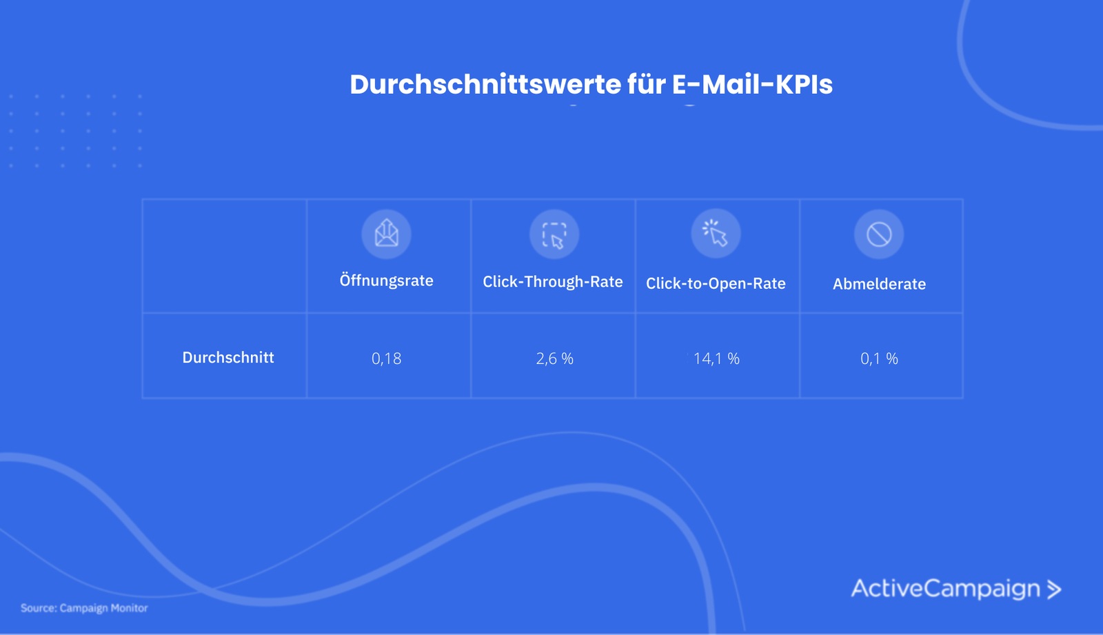Durchschnittswerte von E-Mail-Marketing-KPIs. Diese 4 (durchschnittliche Öffnungsrate, CTR, CTOR und Abmelderate) solltest du beim E-Mail-Tracking auf jeden Fall erfassen. (Quelle: ActiveCampaign)