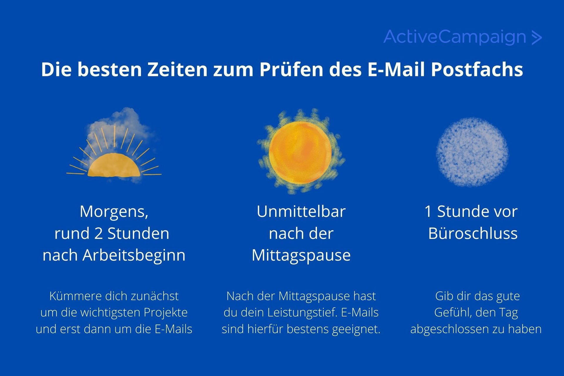 Daneben gibt es aber auch Empfehlungen für die besten Tageszeiten, an denen man sich mit seinem Posteingang beschäftigen sollte. Anstatt also alle paar Minuten im Postfach nachzusehen, empfiehlt es sich 2 oder 3 feste Zeitfenster am Tag für die Bearbeitung von E-Mails zu reservieren.