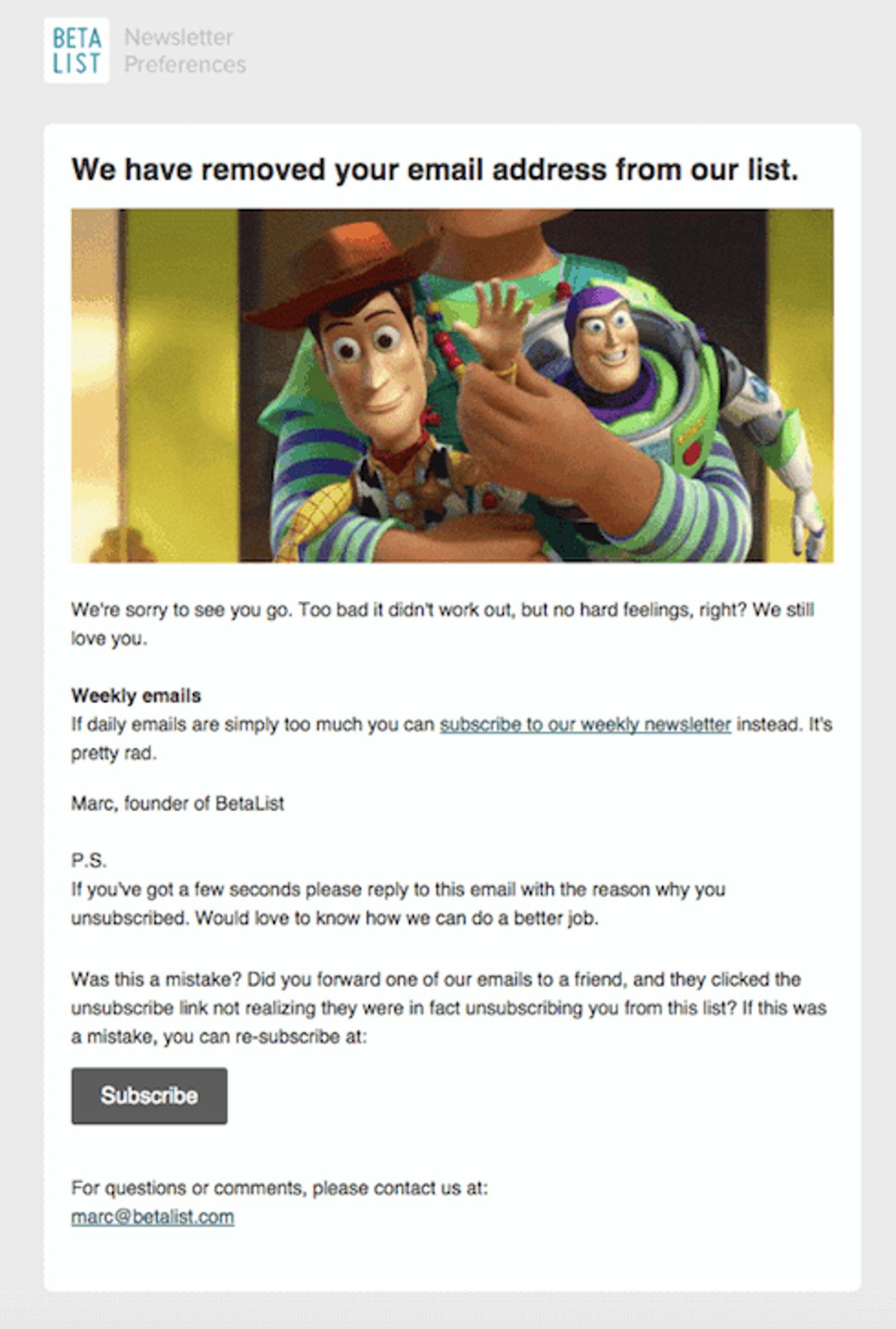 Das ist in Ordnung, es wird Sie nicht zerstören. Bieten Sie einen leicht zu navigierenden Abmeldeprozess an und konzentrieren Sie sich auf die Erstellung großartiger Inhalte, Produkte und Kundenservice-Erfahrungen. Wenn ihnen das zur Verfügung steht, werden sie gar nicht erst auf die Idee kommen, nach einem Abmeldelink zu suchen.