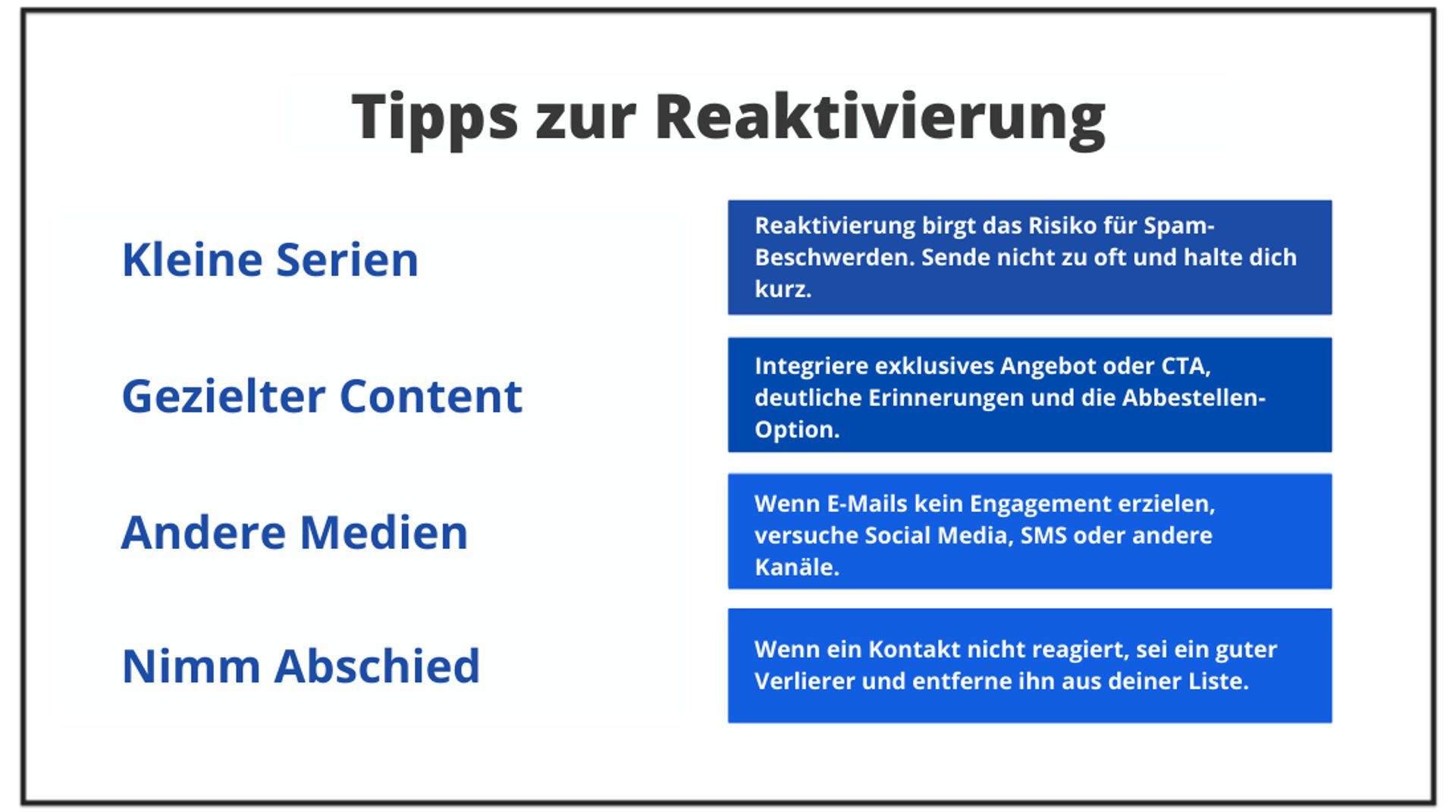 - Reaktivierung erforderlich: Diese Kontakte wirst du wahrscheinlich von deiner Liste löschen müssen, denn ihre fehlende Interaktion kann der Zustellbarkeit deiner E-Mails schaden. Eine Reaktivierung solltest du mit Vorsicht angehen.