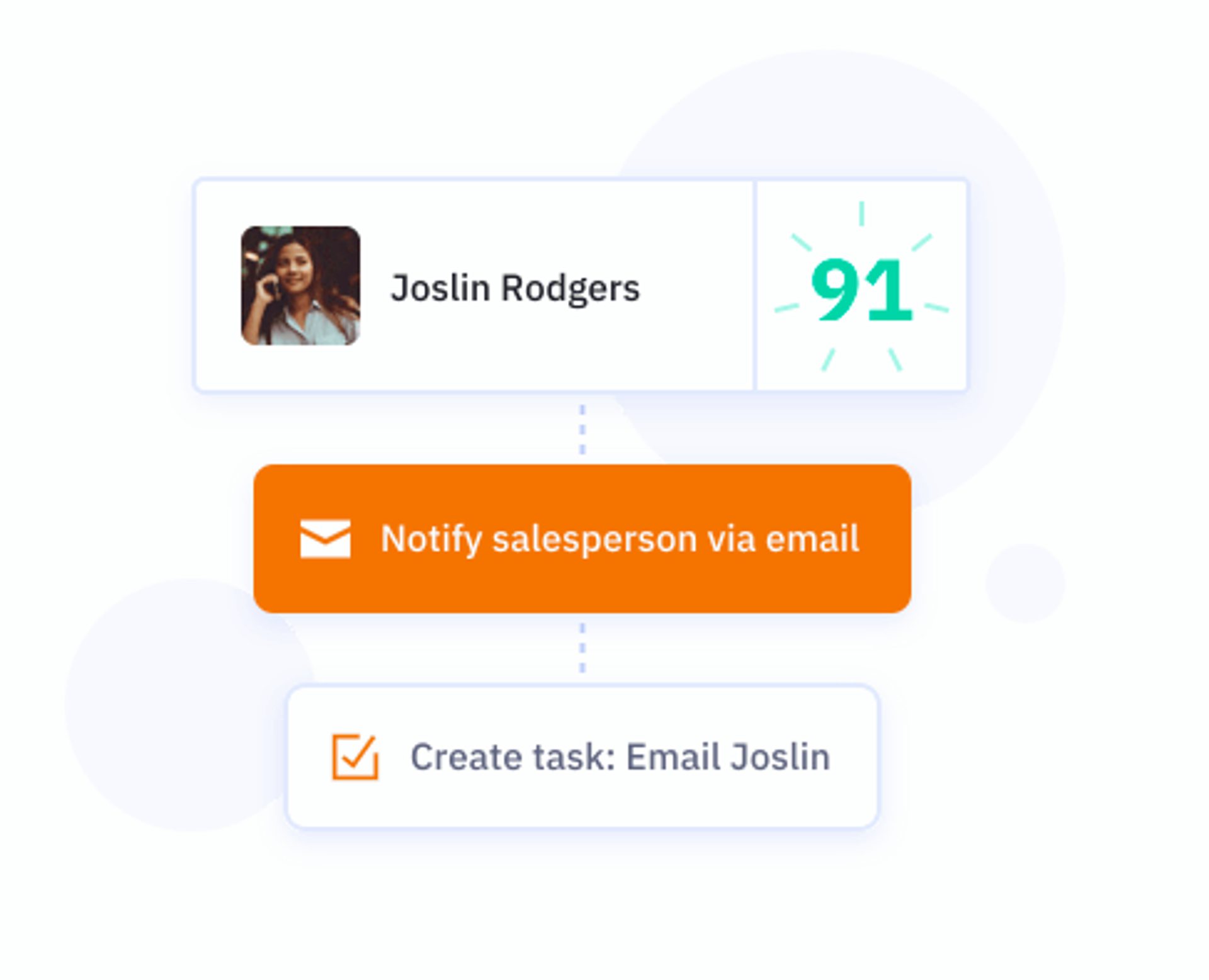 Wenn ein Lead einen bestimmten Punktwert erreicht, ist es für die Vertriebsmitarbeiter an der Zeit, ein Treffen zu vereinbaren oder sich häufiger zu melden. Lege für die letzte Phase fest, welche Vertriebsmaßnahmen bei den verschiedenen Punktwerten ergriffen werden sollten, um einen Verkauf durch deinen Funnel voranzutreiben: je höher der Punktwert, desto näher der Verkauf und desto höher ist die Priorität für das Vertriebsteam.